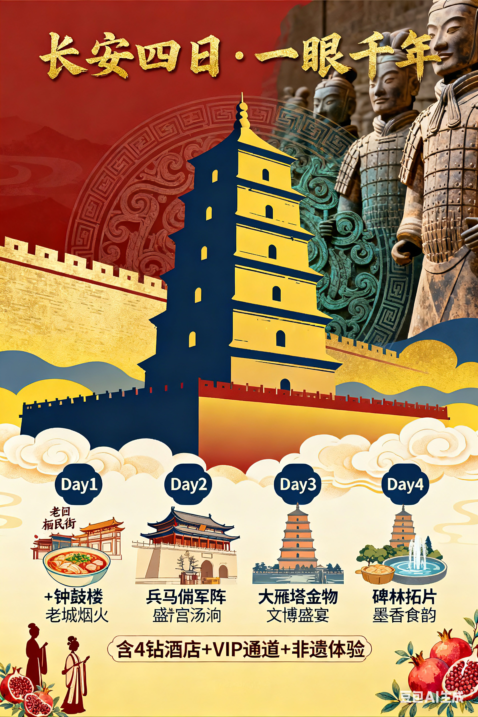 早餐后,乘车前往秦始皇帝陵博物院【秦始皇帝陵博物院】(车程约0.5h)。被誉为“世界第八大奇迹”,展现秦代军事、艺术与科技成就。可以感受到秦朝的宏伟与兴盛。午餐后前往华清宫车程(15min),【华清宫】(2h)位于西安临潼,屋内仍保留着兵谏发生激战时的弹痕;还有九龙湖和芙蓉湖风景区,湖光山色与古建筑相互映衬,景色优美。此外,骊山上的烽火台,时“烽火戏诸侯”典故的发生地。不仅可以欣赏风景,还可以沉浸式体验历史事件。观看《长恨歌》(自费)实景演出剧,再现盛唐风貌与安史之乱的历史沧桑