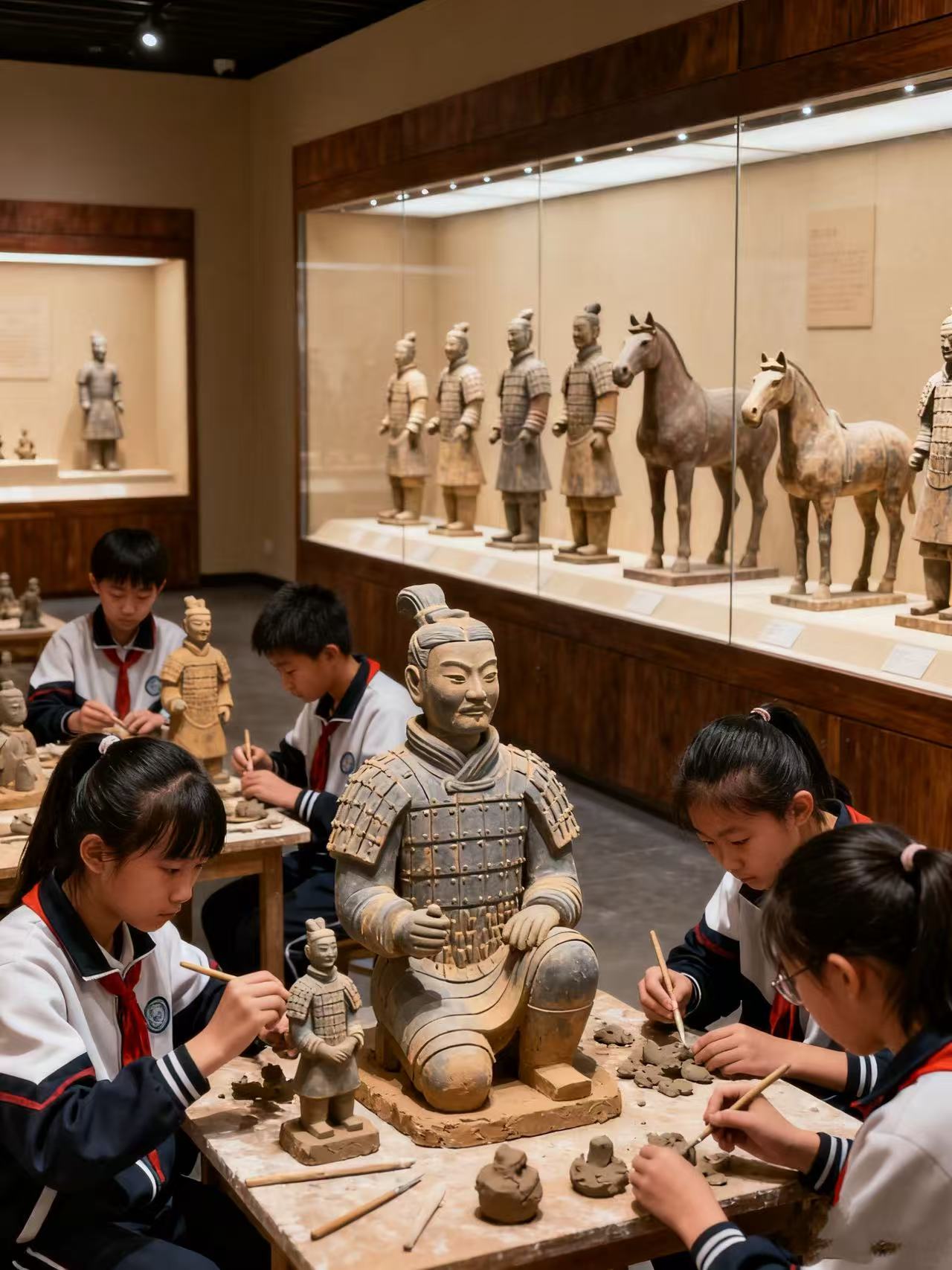 参与诵经活动,感受佛教深厚的文化底蕴。 在秦始皇帝陵博物院参与兵马俑模型制作等互动 参观陕西历史博物馆赏文物、学修复技术