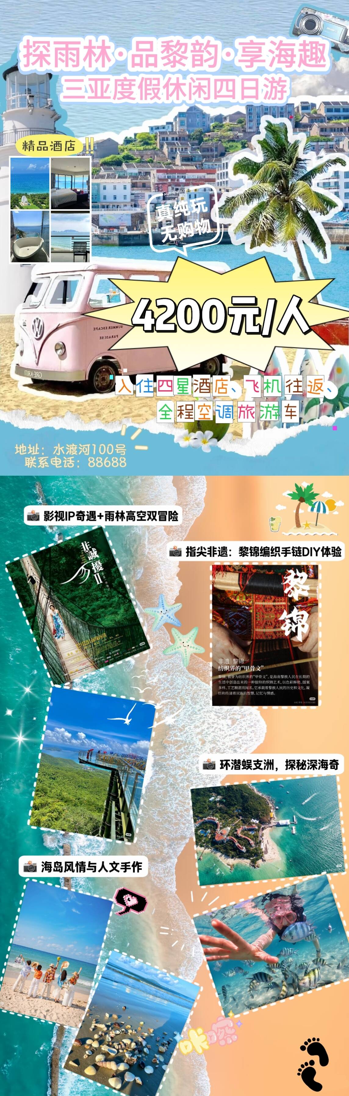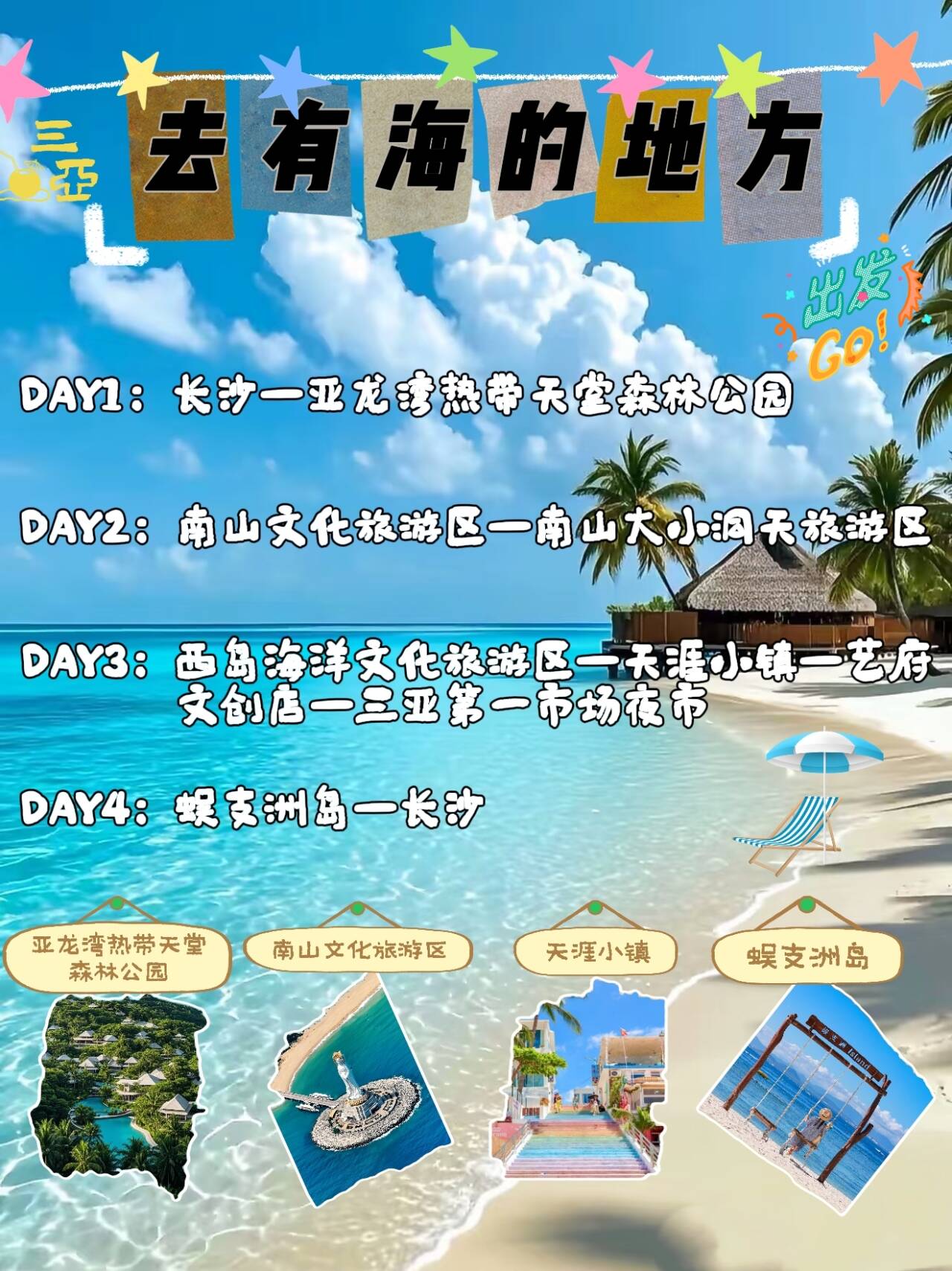 13:00返程肖旗港码头(路程约:0.5h)。驱车前往【天涯小镇】(车程约:0.2h)。天涯小镇有着400年渔村历史,由五条主街组成,每条街都通向大海。小镇以蓝白色调为主,有彩虹楼梯等众多打卡点,还有特色美食和丰富水上运动等项目。14:00到达天涯小镇后,漫步在蓝白色的小巷中,打卡海里里咖啡、麦芽咖啡等店铺。15:00步行前往离沙滩10米处的【艺府文创店】(步行约:0.1h)体验制作贝壳风铃或椰壳画等手工艺品。17:00驱车前往【第一市场夜市】(车程约:0.3h)。三亚第一市场夜市是三亚成名较早的夜市,这里充满浓厚的海岛风情和烟火气,是感受三亚市井生活的好去处。晚餐自费。