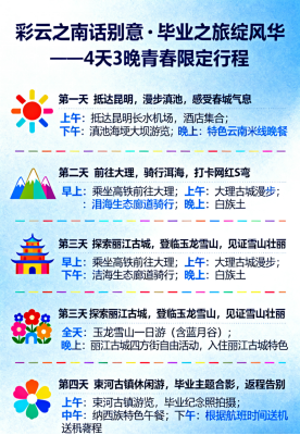 早8:00乘大巴赴大理,为南诏大理国都城,素称“文献名邦”,以苍山洱海、风花雪月(下关风、上关花、苍山雪、洱海月)闻名。白族扎染工艺独特,三道茶“一苦二甜三回味”蕴含人生哲理。四季如春,环海骑行、崇圣寺三塔为必游体验。(游玩3h),乘游船环【洱海】洱海为云南第二大淡水湖,因形如耳得名,苍山相伴,三塔倒映,是白族“母亲湖”,环湖风光旖旎,骑行观鸟皆相宜,赏苍山倒影,登南诏风情(游玩2.5h),用完午餐后旅拍毕业照活动(活动3h)返程 大理到昆明D877 昆明长水机场至黄花机场东航mu5827)