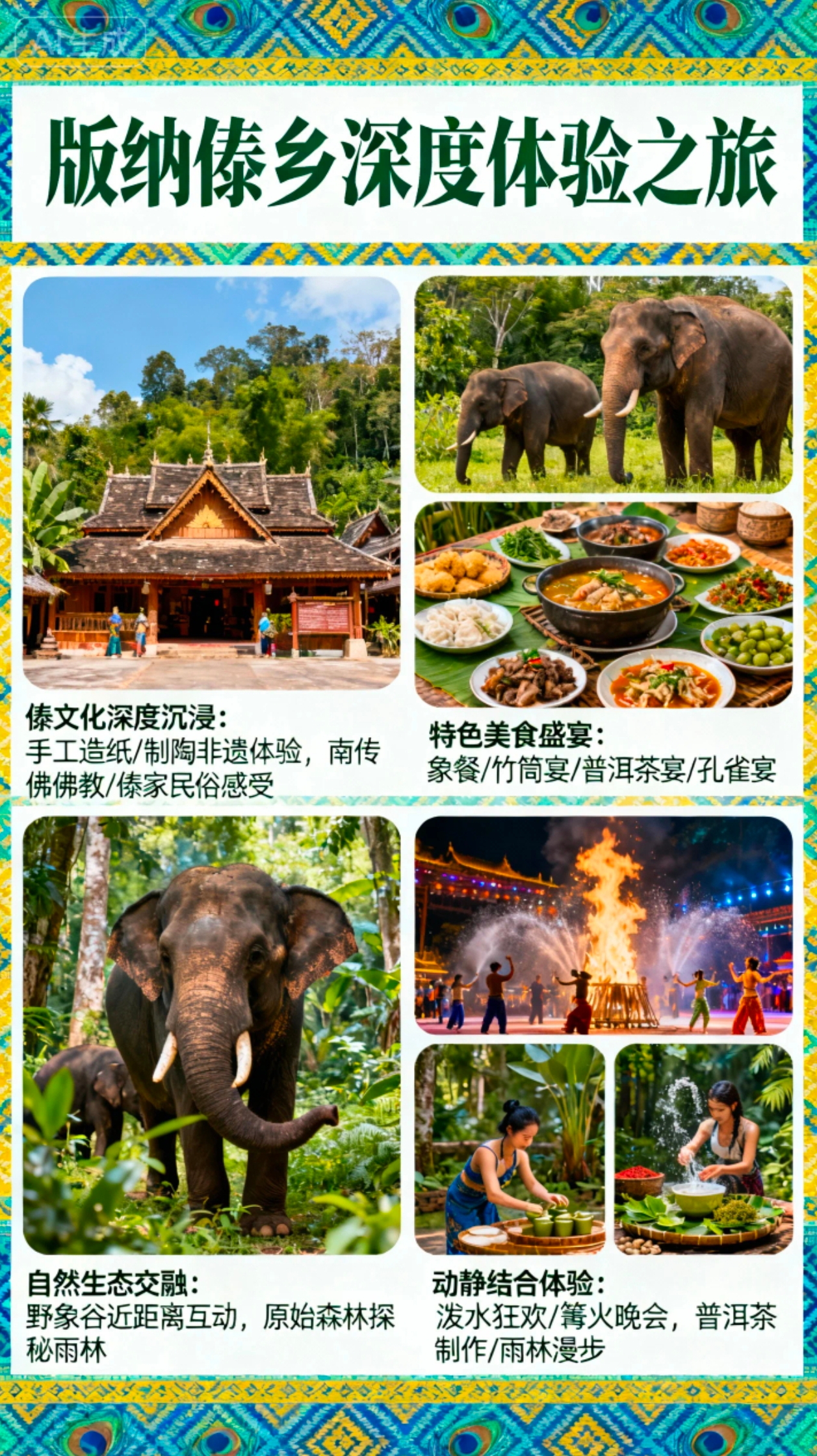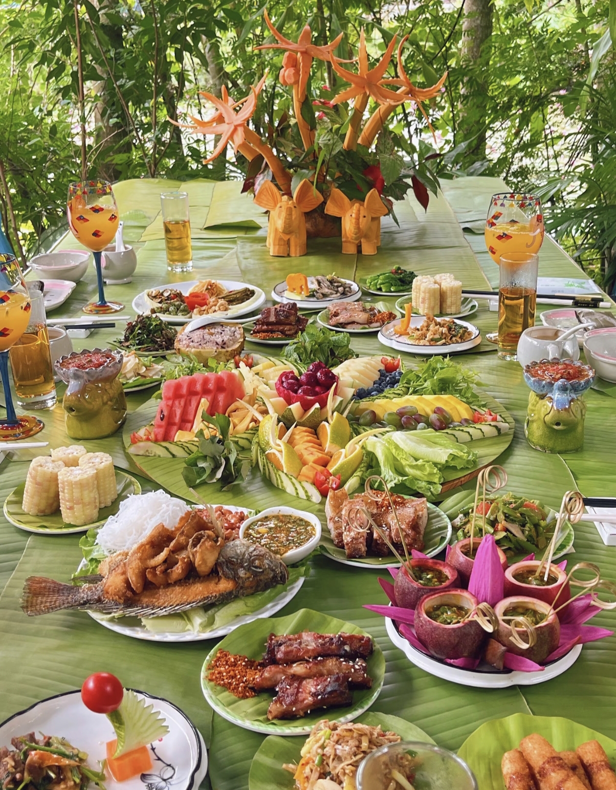 午餐我们特别安排傣味孔雀宴。何谓“孔雀宴”,孔雀宴就是过去傣族皇室接待贵宾的宴席,是傣家最具特色的宴席之一,它耐合了傣族人民聪明、勤劳和爱美的特性。孔雀宴汇聚了傣家最具特色的佳着美味,采集原生态新鲜食材用烤、炸、煎、炒、煮、凉、蒸、春等傣家传统烹饪方法精心制作而成,摆放成孔雀开屏的形状,象征着幸福安康象征着吉祥如意。