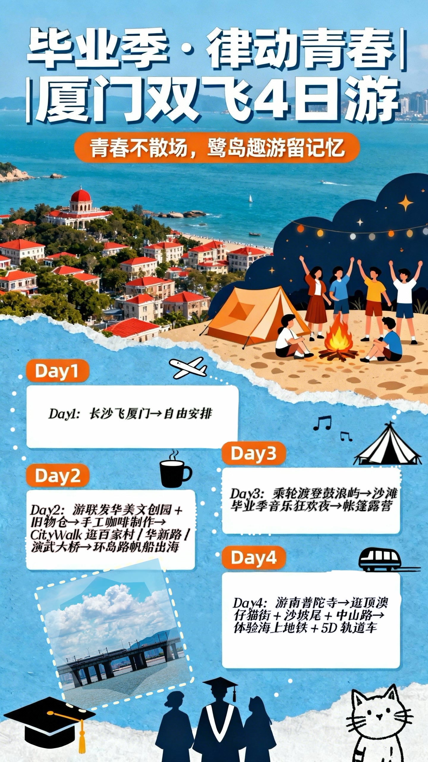 早餐后,乘车前往码头乘坐轮渡前往【鼓浪屿】(轮渡时间20分钟)(备注:①上鼓浪屿岛的时间以船务公司确认的票务时间为准,到时行程可能会前后调整;②鼓浪屿上严禁导游使用扩音器,建议游客自行租用无线耳麦10元/人听详细讲解;③鼓浪屿上特产店、小吃店遍布,游客购买为个人商业行为);游南洋风情的别墅群,旅游购物龙头路一条街,观“万国建筑博物馆”之称的鼓浪屿岛;游客可在鼓浪屿【龙头街】漫步,还可前往【港仔后海滨浴场】:拥有鼓浪屿最美的海滩,是景好、砂好、水质好、气候好的理想天然海滨浴场;下午约定时间返回厦门市区,后安排【沙滩毕业季.音乐狂欢夜】:抵达前往【帐篷基地】搭建属于你的“家”,每组合伙人要【亲手搭帐篷】,要想有地方睡要和伙伴合伙搭建属于你们自己的“小窝”为你们遮风挡雨,其中的酸甜苦辣只有自己知道(如果有不会搭建的可以询问帐篷的主人或者其他会搭建的伙伴)海边趣味【沙滩排球比赛】在沙滩上进行【拔河比赛】(烧烤DIY,BBQ)晚会,导游为大家准备了升火用品及烧烤材料,同学们可自自己动手烧烤,尽情享受自助BBQ的美食,还可围着火堆,看场露天电影,迎着海风,尽情的欢歌乐舞……活动结束后,回到自己搭建的帐篷休息(2人一帐篷),枕着沙滩,听着涛声入眠…