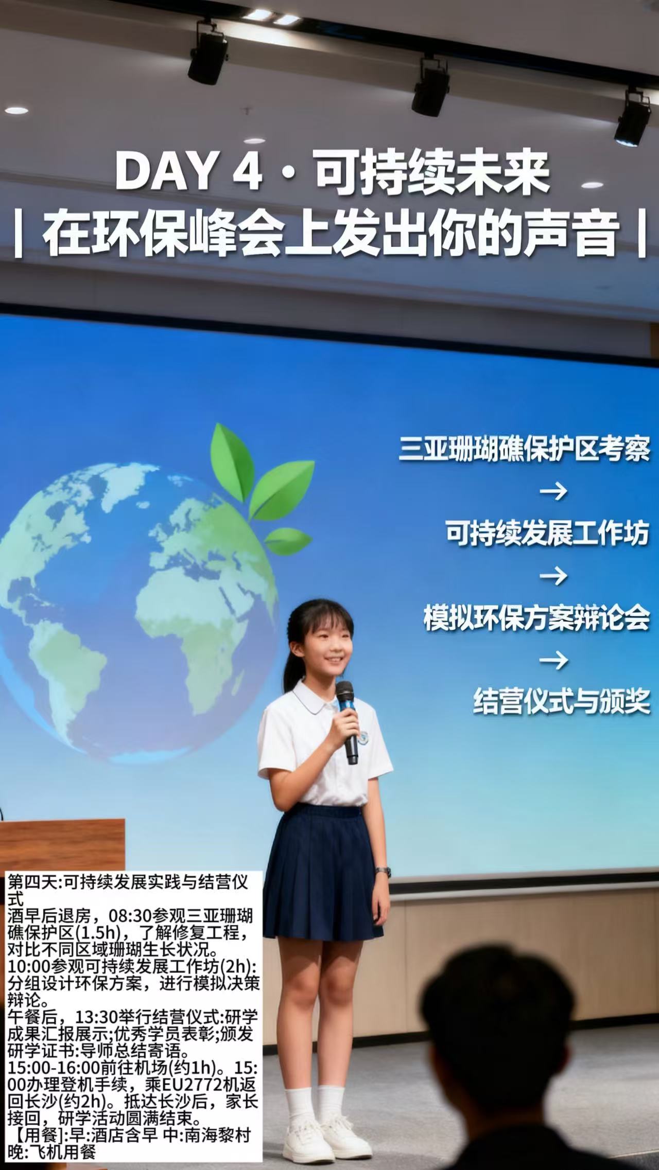 参观三亚珊瑚礁保护区 → 可持续发展工作坊:环保方案设计与模拟辩论 → 结营仪式,颁发证书 → 返程。