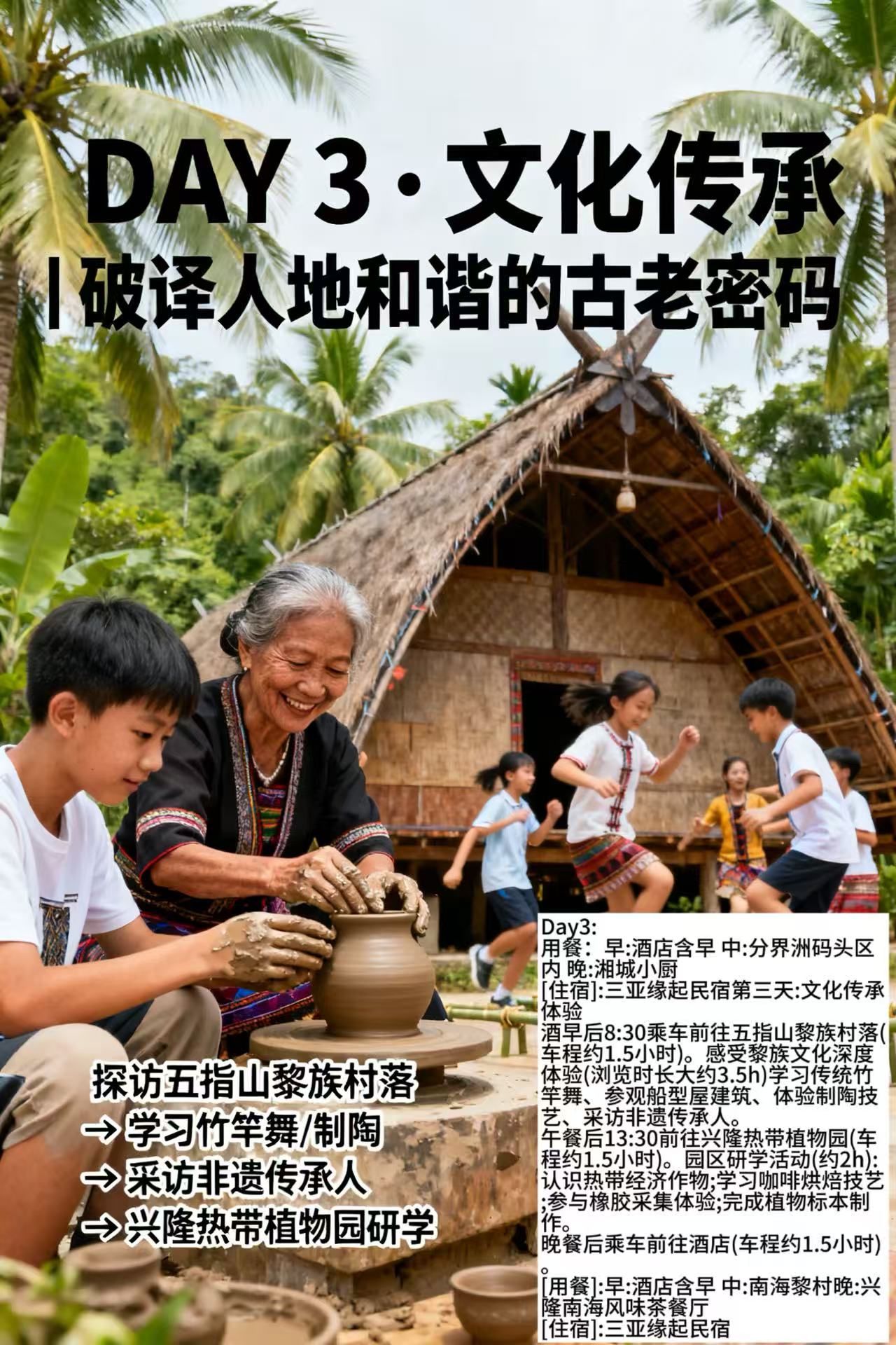 深入【五指山黎族村落】,学习竹竿舞、制陶等非遗技艺 → 探访【兴隆热带植物园】,认识热带经济作物。