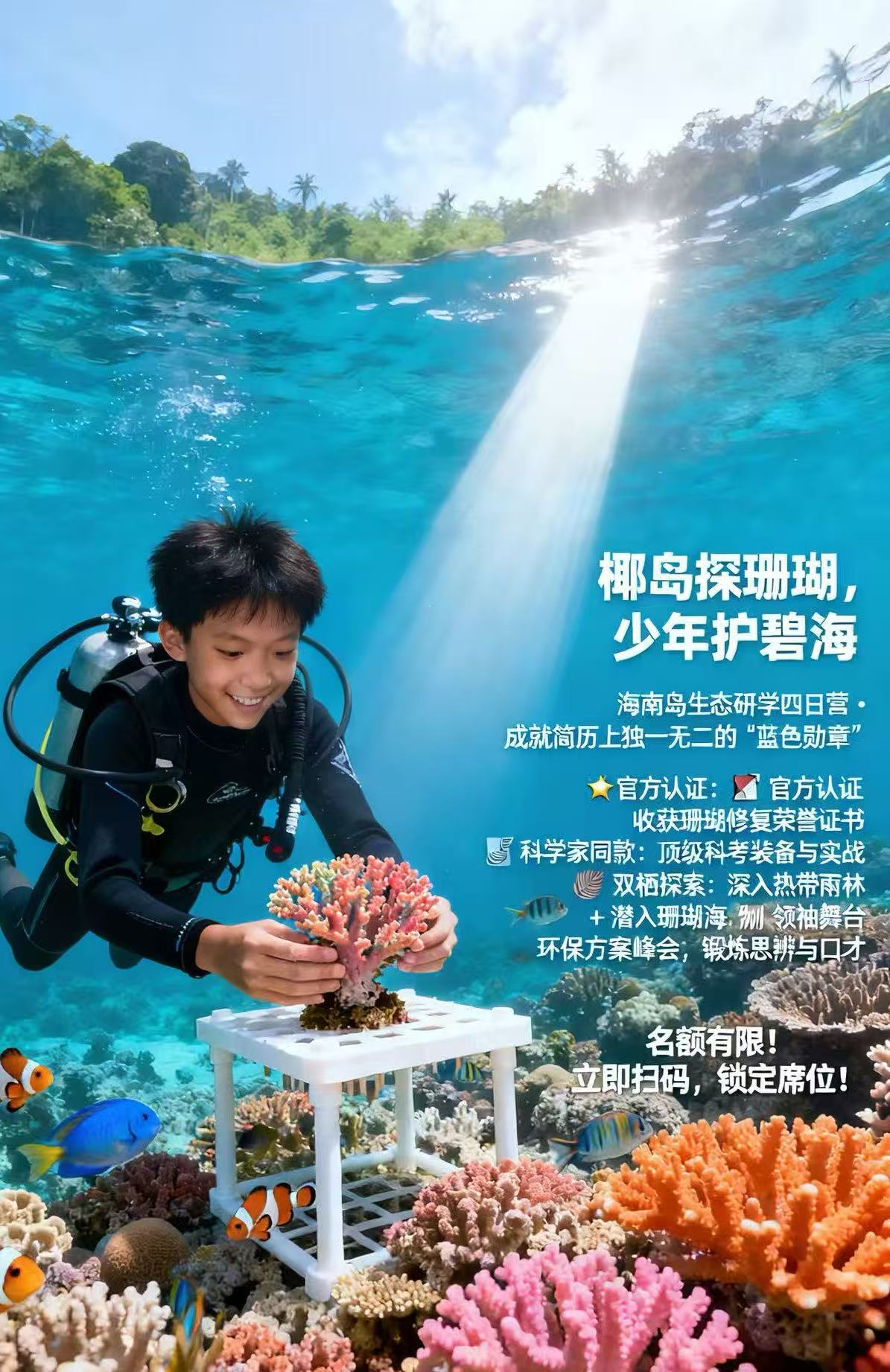一次研学,双重收获! 让孩子从虚拟世界走向蔚蓝大海,化身“珊瑚医生”,收获官方认证的环保履历,在真实场景中完成从知识接收到行动输出的成长蜕变。