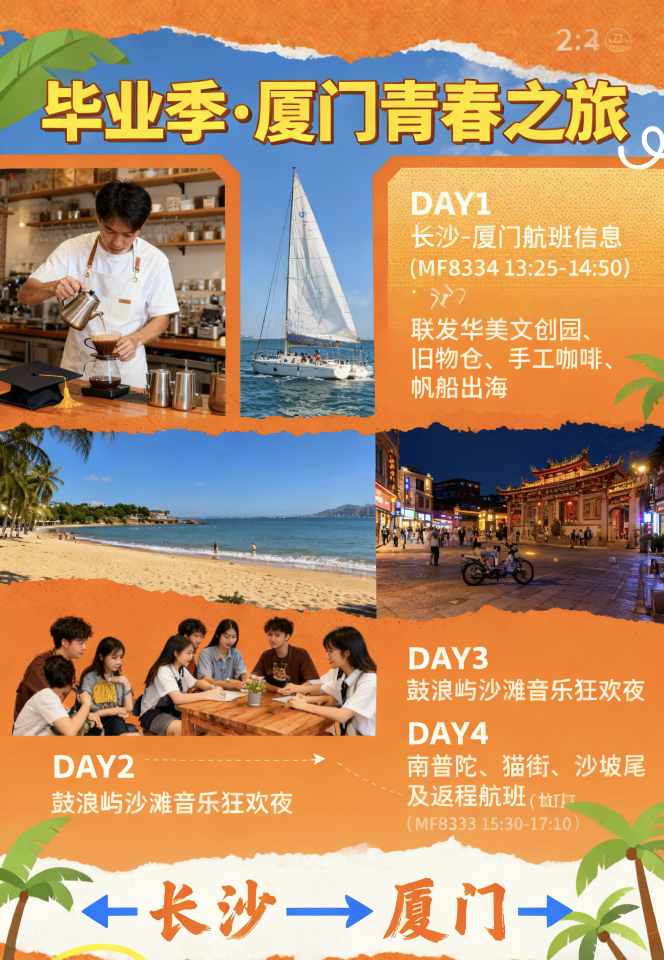 早餐后,前往游览昔日的“华美制烟”老厂房改造的【联发华美文创园】时尚艺术的影子,再到厦门老物件的聚集地【旧物仓】搜罗古董玩意。安排一次独特的【手工咖啡制作体验】。午餐后以CityWalk的方式带大家重新认识厦门,一起到土生土长的老城区看看,走过市井的【百家村】,途径诗意【华新路】还可步行至【演武大桥观景台】;后于【环岛路帆船中心】乘帆船出海体验:美丽迷人的五缘湾景,海天一色的蓝色天堂,升帆、拉帆亲身体验水上运动的激情与魅力!将烦恼、疲倦和困惑统统抖落在容纳百川的大海里。后车送酒店休息。