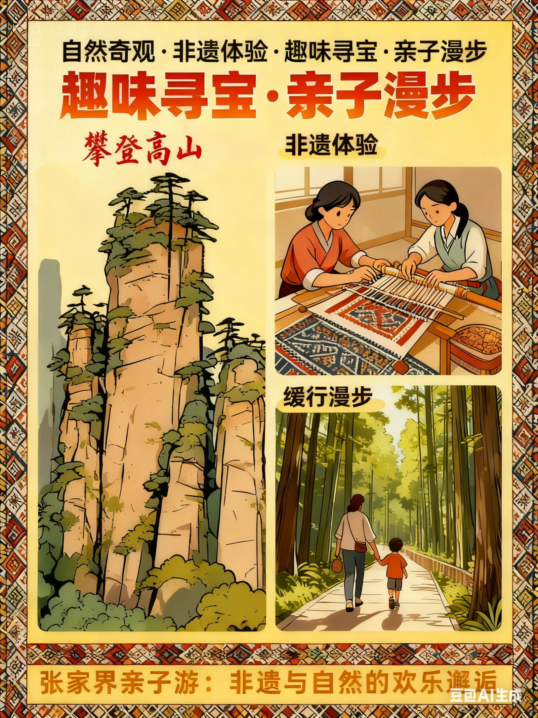 17:30:前往土家风情园。观看摆手舞、茅古斯舞非遗歌舞表演,亲子家庭可跟随演员学习简单舞蹈动作,感受土家族热情活力;在 “亲子织锦工坊”,由专业手工艺人指导,协作完成西兰卡普简易挂饰,成品可作为旅游纪念带走。