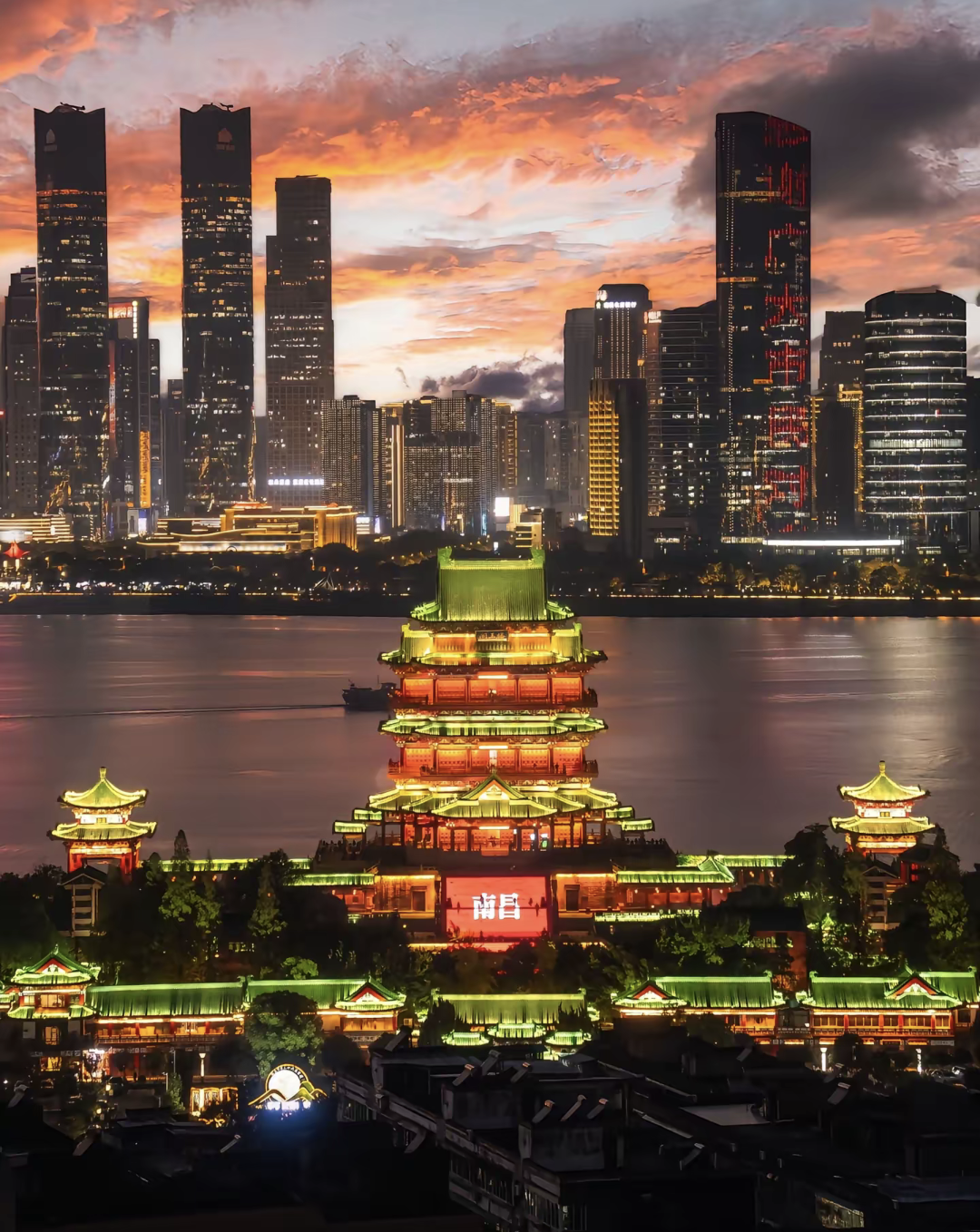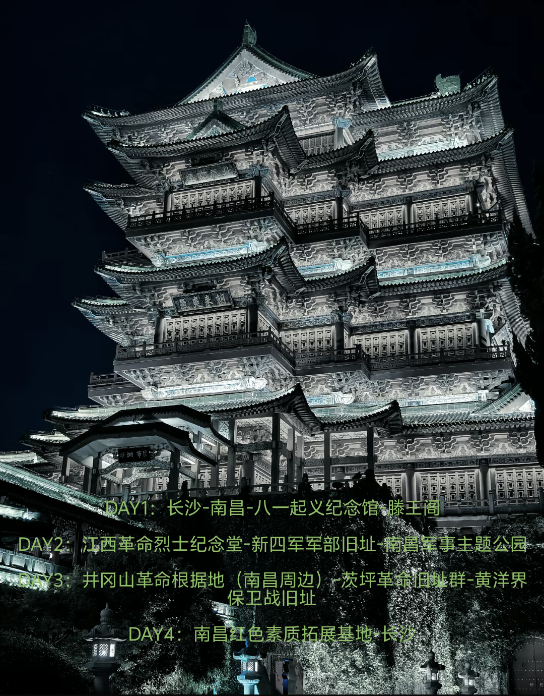 7:10 从学校指定地点集合,前往长沙南高铁站乘坐 G1402 次高铁(8:20-10:05)赴南昌(行驶时间约 1.75 小时)。抵达后前往指定酒店办理入住(行驶时间约 0.3 小时),在酒店会议室举行【开营仪式】(时长约 0.5 小时),明确研学目标与纪律。11:30 前往南昌特色餐厅享用午餐,品尝南昌特色瓦罐汤、南昌炒粉。13:00 前往【八一起义纪念馆】(周一闭馆)(游览时间约 2 小时),由专业讲解员介绍八一起义历史背景、过程与意义,参观文物展品与场景复原展区,开展“模拟军事会议”互动活动。16:30 前往【滕王阁】(游览时间约 1.5 小时),了解滕王阁历史文化,赏析“落霞与孤鹜齐飞,秋水共长天一色”的意境,感受古代文人的家国情怀。18:30 享用晚餐后,返回酒店休息。