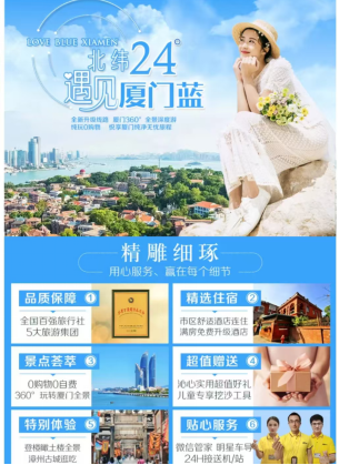 早餐后,前往【鼓浪屿】这里无车马的喧嚣,有的是鸟语和花香,漫步小巷能偶遇写生的市民,弹唱的街头艺人。岛上遍布着各国的建筑,古罗马式建筑、哥特式建筑、拜占庭式建筑、文艺复兴式建筑、古典主义建筑、中西结合的老别墅,堪称【万国建筑博览】。沿途参观林巧稚大夫【毓园】倾听“万婴之母”林巧稚女士的故事。【海天堂构】老别墅是中西方文化结合的典范之作。门楼是典型中国传统式样,前后两侧的楼宇,普遍采用古希腊柱式,窗饰大都为西洋风格,但墙面与转角又是中国雕饰,斗拱装饰走廊外沿,显得格外稳重。在老别墅里,还能欣赏到难得一听的“御前清曲”、非物质文化遗产南音,观看木偶戏世家精彩绝伦的表演。自由活动期间,可到【龙头路商业街】品茗美食,拿着我们赠送给您的手绘地图和盖章本,穿梭于各式风格的特色小店之间。感受时下最流行的“抖音-土耳其冰淇淋”的套路吧......