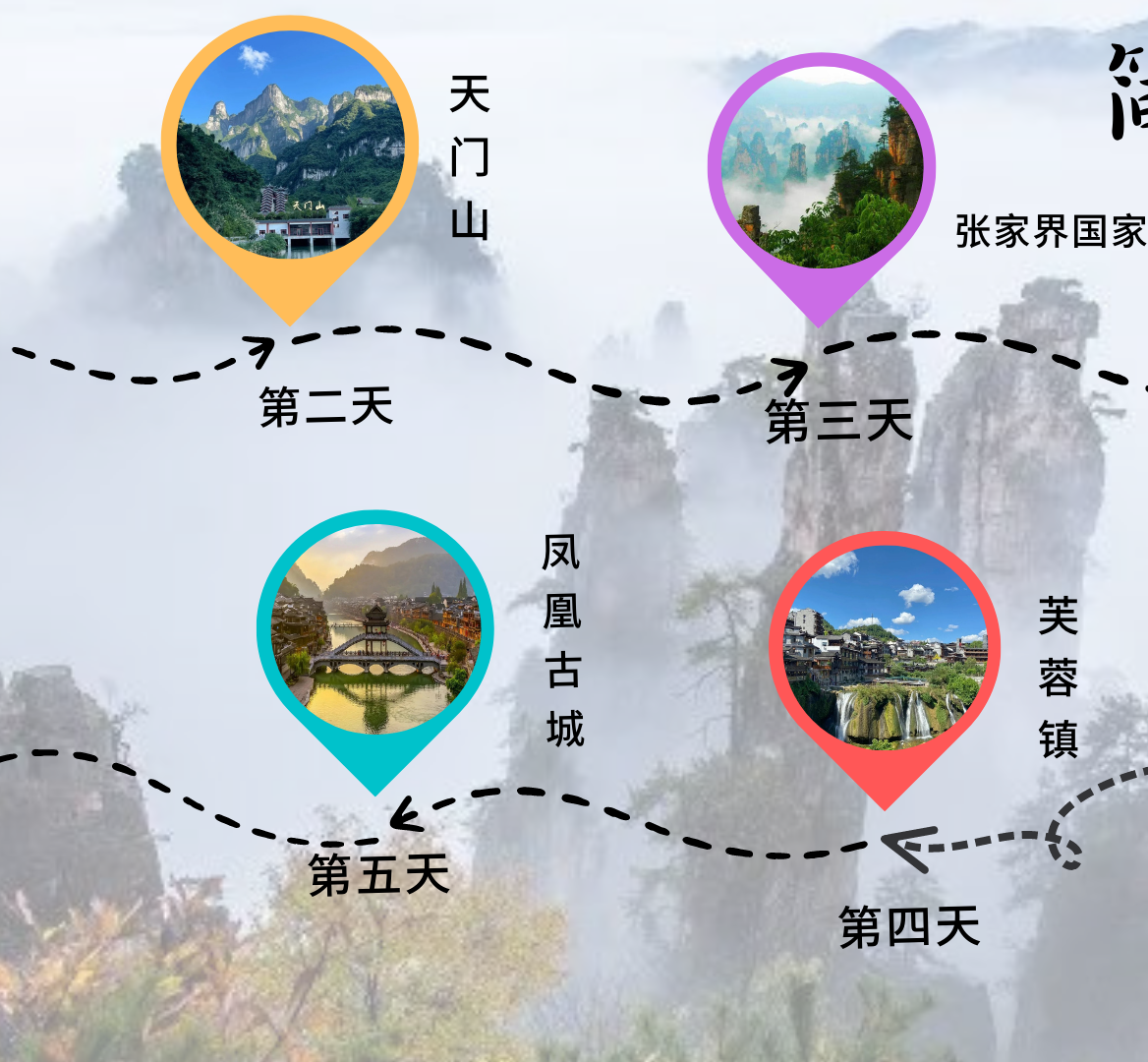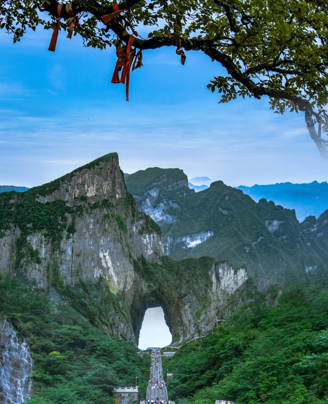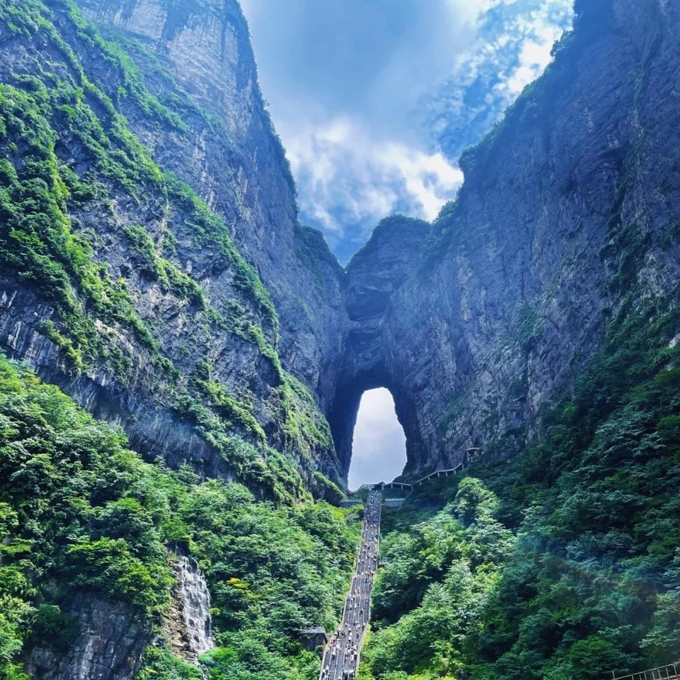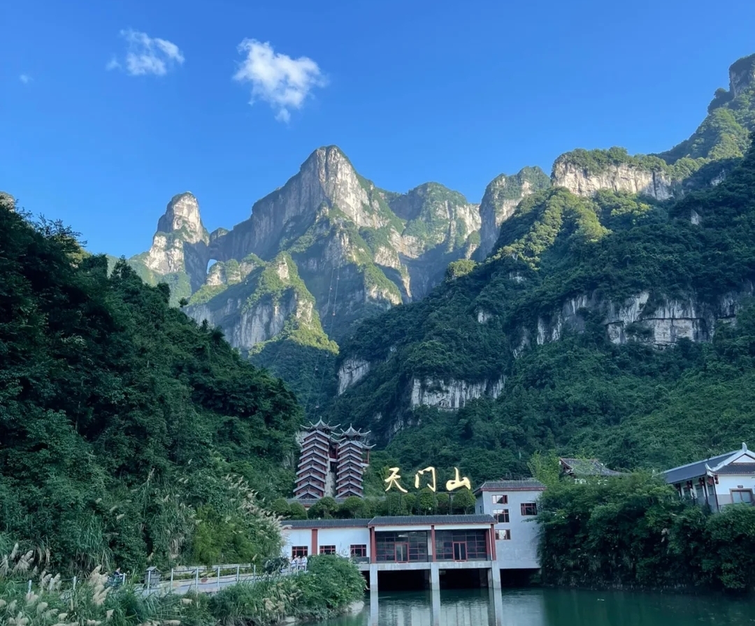 早餐后游览“人类第一次架机穿越自然山洞”、“中国最受外国人欢迎的五十个地方之一”——【天门山国家森林公园】,乘坐世界最长的高山客运索道——【天门山索道】,体验凌空飞仙般的神奇感觉,空中欣赏壮丽的山水画长卷,直达天门山山顶,观赏奇妙美丽的盆景花园,游览【玻璃栈道】,体验“云生脚下、奇峰尽览、万象目中”豪迈感觉。山顶游玩后座索道下山至中转站换乘环保车,感受【通天大道】的惊奇体验沿途观赏七级瀑布、金龟驮元宝、将军峰、箭杆峰等景观。抵达上天梯,攀登999级台阶的上天梯,抵达天门洞底,感受造化神奇,尽情欣赏天门洞内外的壮丽景色。