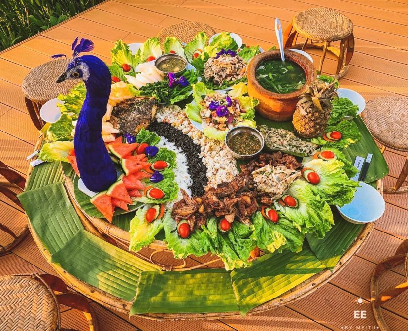 午餐我们特别安排傣味孔雀宴。何谓【孔雀宴】,孔雀宴就是过去傣族皇室接待贵宾的宴席,是傣家最具特色的宴席之一,它融合了傣族人民聪明、勤劳和爱美的特性。孔雀宴汇聚了傣家最具特色的佳肴美味,采集原生态新鲜食材用烤、炸、煎、炒、煮、凉、蒸、舂等傣家传统烹饪方法精心制作而成,摆放成孔雀开屏的形状,象征着幸福安康象征着吉祥如意。