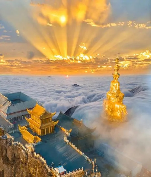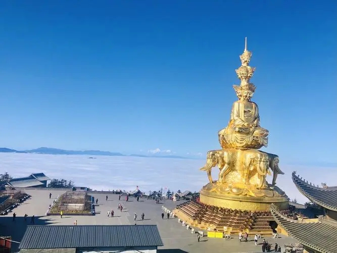 14:00 游览峨眉山金顶(2小时)乘坐观光车至雷洞坪,徒步至接引殿。峨眉金顶是以一尊48米高的十方普贤铜像为中心,由耀日的金殿、雄浑的铜殿、灼灼的银殿和洁白的朝圣大道组成的新金顶。金顶为峨眉山游程的最高峰,其海拔为3077米。顶上是个小平原,原有铜殿一座,在太阳的照射下,光彩夺目,故而得名金顶。登上金顶,人们顿觉万象排空,气势磅礴,惊叹天地之奇妙。