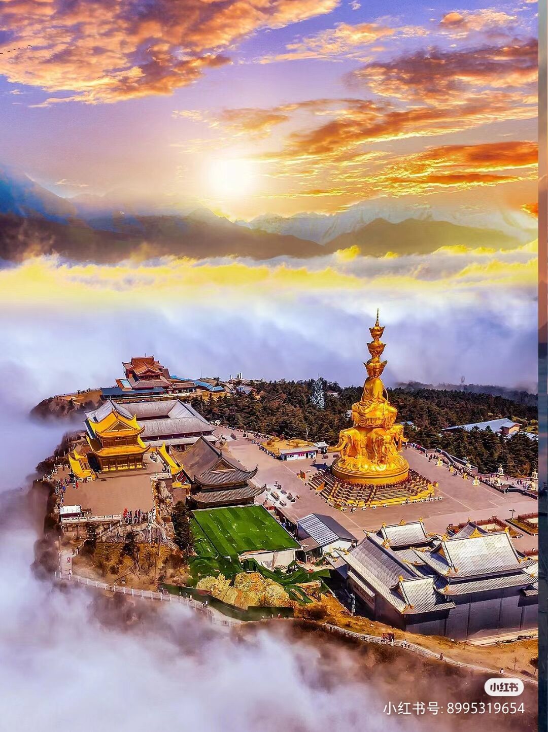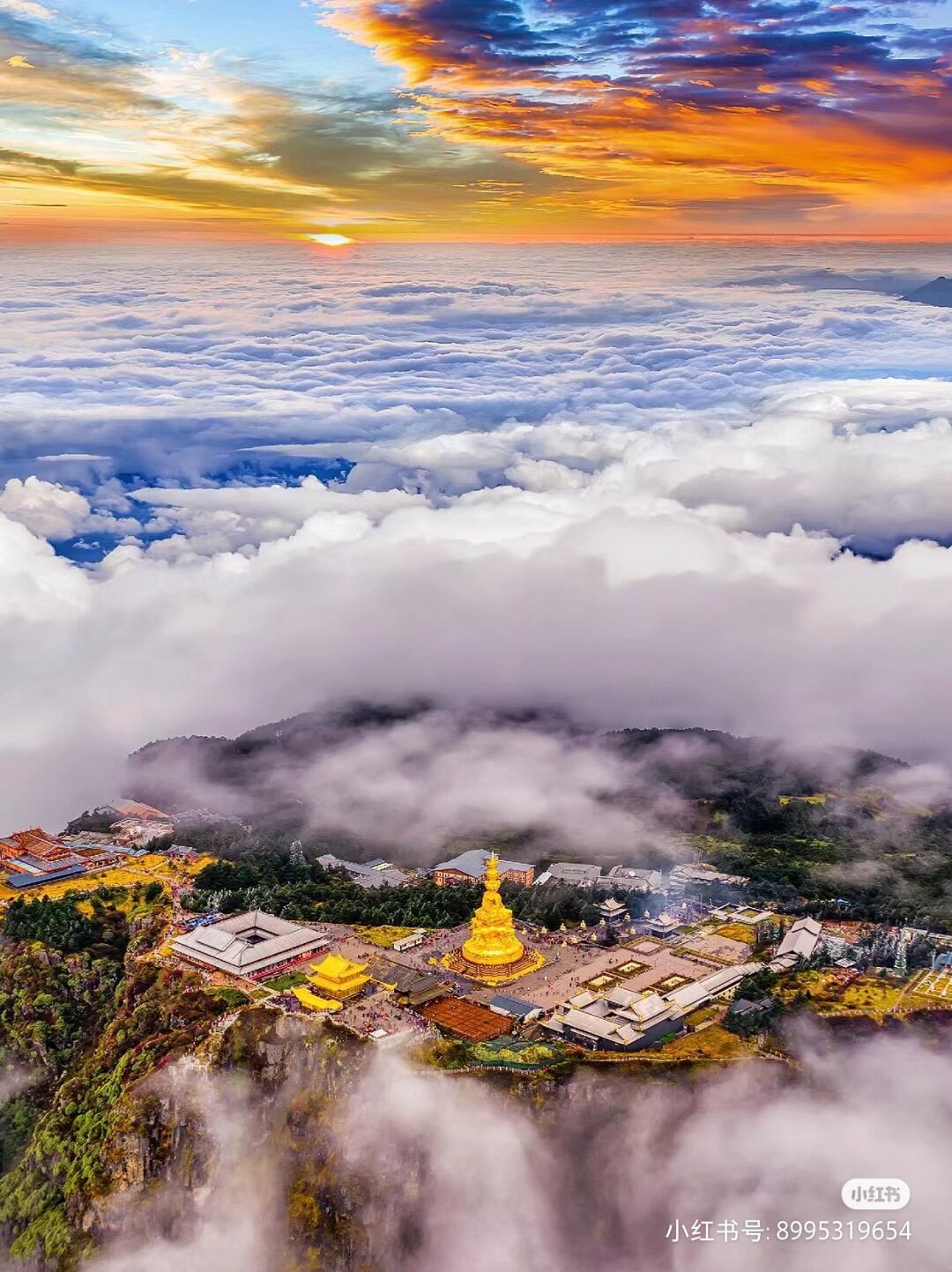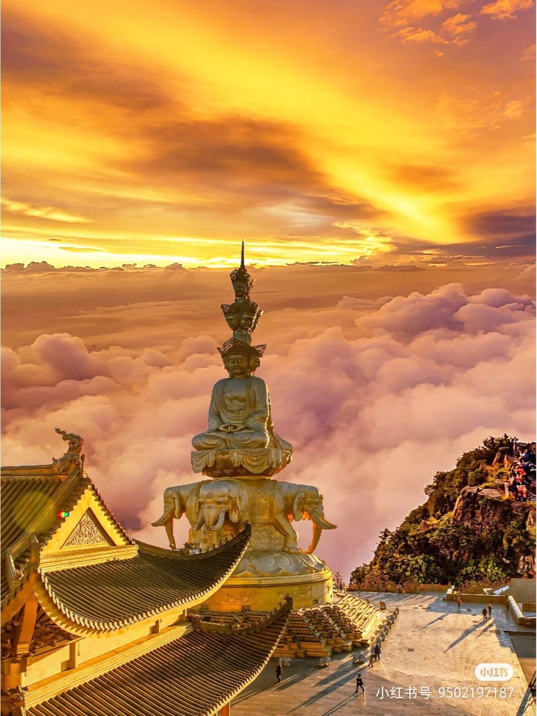 午餐后乘坐金顶往返索道(费用自理,往返120元/人)上金顶。峨眉金顶是以一尊48米高的十方普贤铜像为中心,由耀日的金殿、雄浑的铜殿、灼灼的银殿和洁白的朝圣大道组成的新金顶。金顶为峨眉山游程的最高峰,其海拔为3077米。在峨眉山金顶,还可能欣赏峨眉的四大奇景:日出、云海、佛光、圣灯。