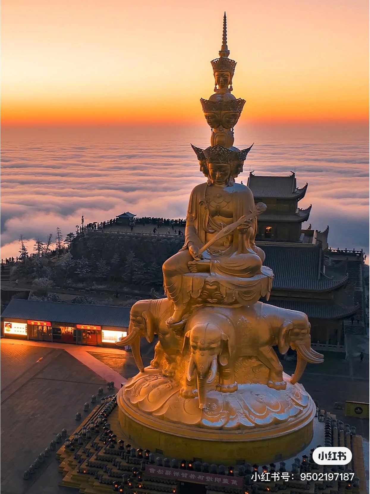 早餐后,前往峨眉山。【峨眉山-金顶】乘坐观光车(费用90元自理,上行索道80/下行索道40需自理)至雷洞坪,徒步至接引殿。峨眉金顶是以一尊48米高的十方普贤铜像为中心,由耀日的金殿、雄浑的铜殿、灼灼的银殿和洁白的朝圣大道组成的新金顶。金顶为峨眉山游程的最高峰,其海拔为3077米。在峨眉山金顶,还可能欣赏峨眉的四大奇景:日出、云海、佛光、圣灯。