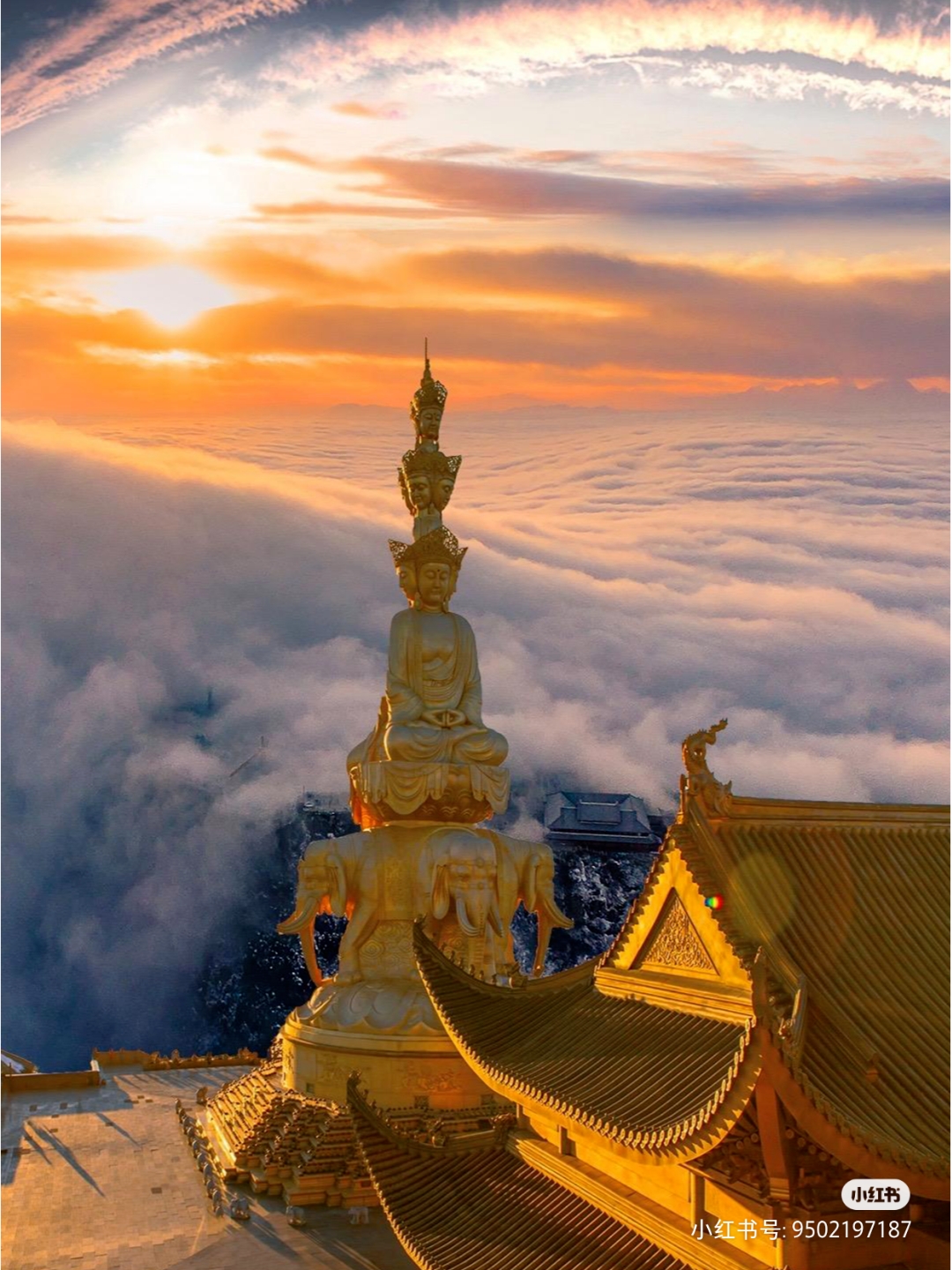 午餐后乘坐金顶往返索道(费用自理,往返120元/人)上金顶。峨眉金顶是以一尊48米高的十方普贤铜像为中心,由耀日的金殿、雄浑的铜殿、灼灼的银殿和洁白的朝圣大道组成的新金顶。金顶为峨眉山游程的最高峰,其海拔为3077米。在峨眉山金顶,还可能欣赏峨眉的四大奇景:日出、云海、佛光、圣灯。