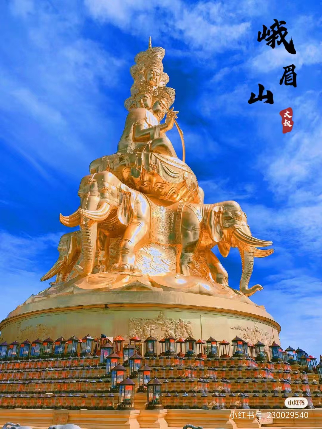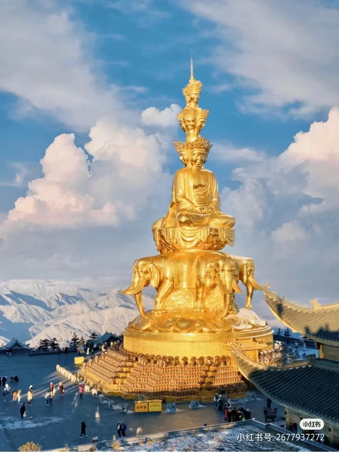 后出发游览峨眉山金顶游览【峨眉山-金顶】:乘坐观光车至雷洞坪,徒步1.5 公里约 40 分钟至接引殿,途经雷洞坪猴区,可以戏峨眉山野生猴群。午餐后,乘坐金顶往返索道上金顶。峨眉金顶是以一尊48米高的十方普贤铜像为中心,由耀日的金殿、雄浑的铜殿、灼灼的银殿和洁白的朝圣大道组成的新金顶。金顶为峨眉山游程的最高峰,其海拔为3077米。在峨眉山金顶,还可能欣赏峨眉的四大奇景:日出、云海、佛光、圣灯。