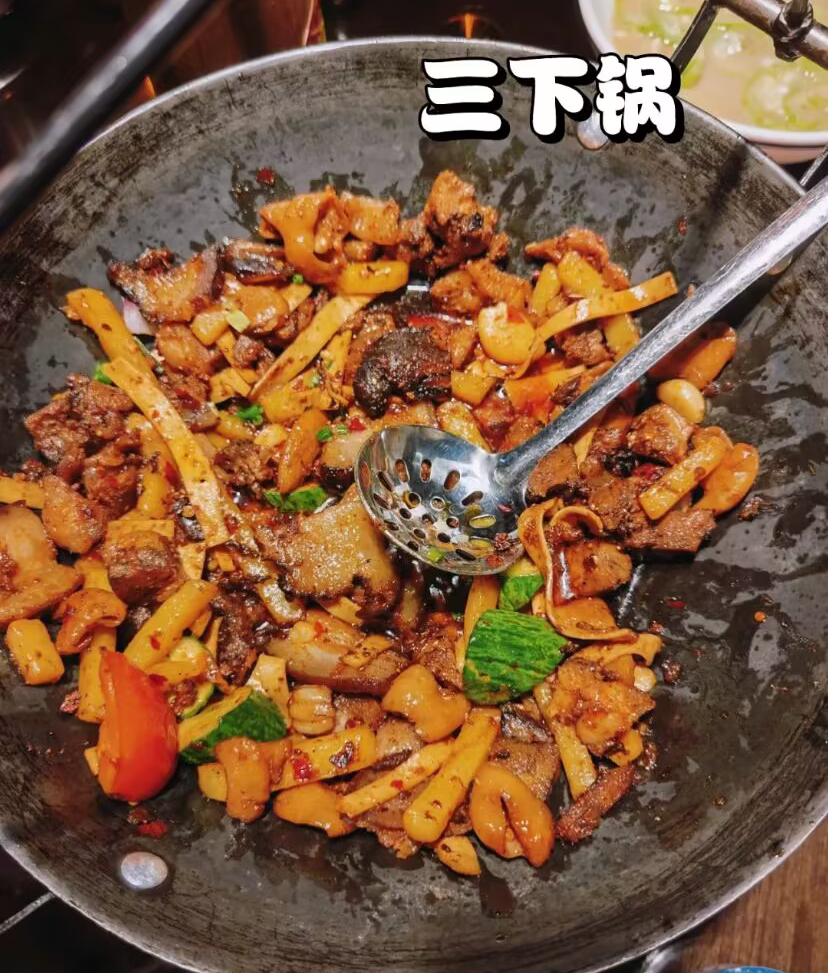 中餐升级为特色风味餐【三下锅】,张家界头牌菜,2009年荣登湖南14市州故乡菜之首。传明代嘉靖年间,朝廷征调湘鄂西土司兵上前线抗倭,恰好赶上年关,为不误军机,土司王下令提前—天过年,于是腊肉、豆腐、萝卜一锅煮,叫吃“合菜”,逐演变成“三下锅”。