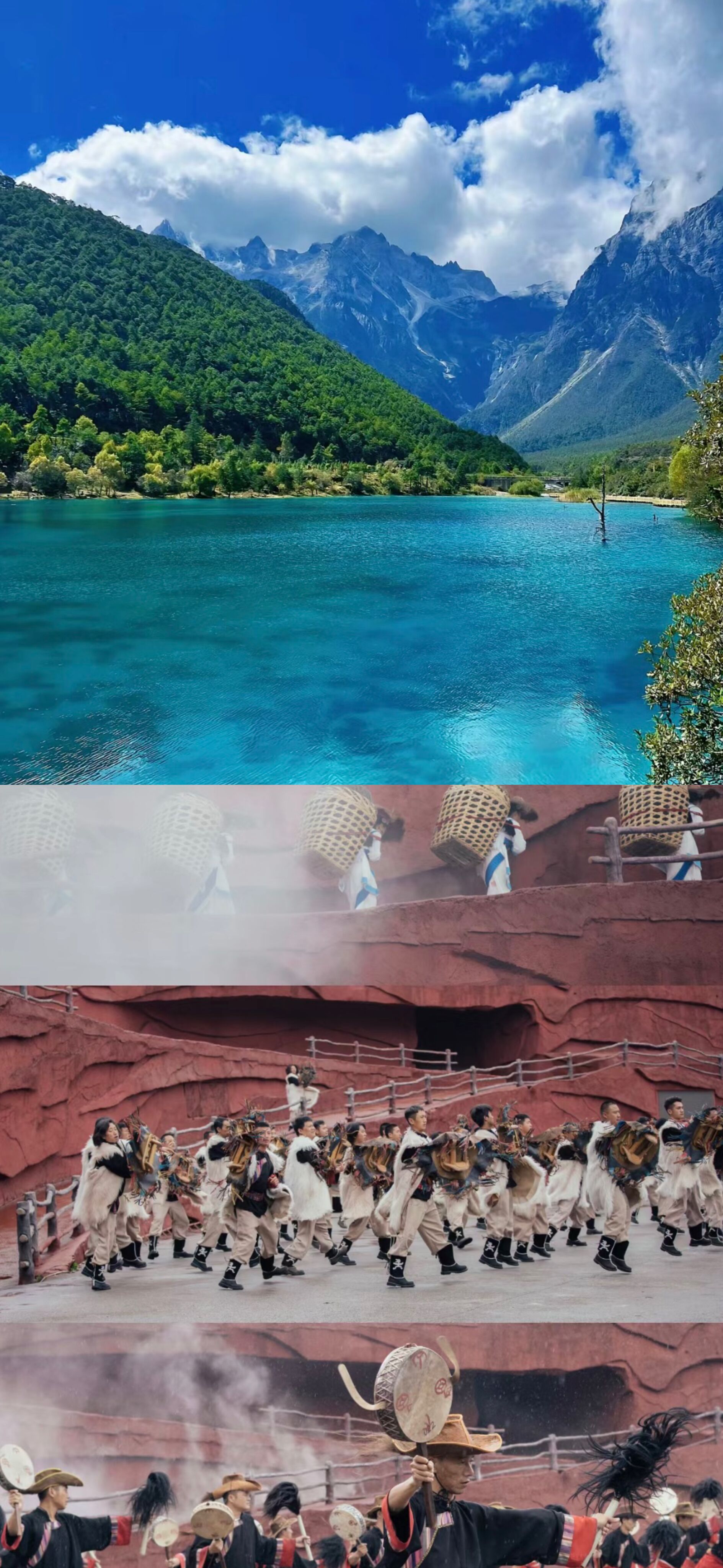 晚上赠送以歌舞诗画的形式,荟萃丽江奇山异水孕育的独特的滇西北高原民族文化表演《丽水金沙》或者《云南的响声》这台演出中,你会看到,不论是锄头钉耙,还是水车石磨,只要是手中能拿的,口中能含的,几乎都被当成乐器来演奏;据统计,被搬到舞台上来的云南民族民间乐器,大约有几百件之多!(特别声明:赠送项目如自愿放弃,不退费用)。