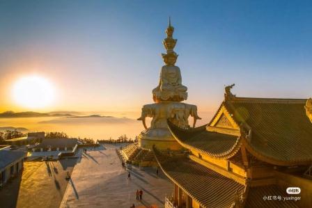 午餐后乘坐金顶往返索道(费用自理,往返120元/人)上金顶。峨眉金顶是以一尊48米高的十方普贤铜像为中心,由耀日的金殿、雄浑的铜殿、灼灼的银殿和洁白的朝圣大道组成的新金顶。金顶为峨眉山游程的最高峰,其海拔为3077米。在峨眉山金顶,还可能欣赏峨眉的四大奇景:日出、云海、佛光、圣灯。