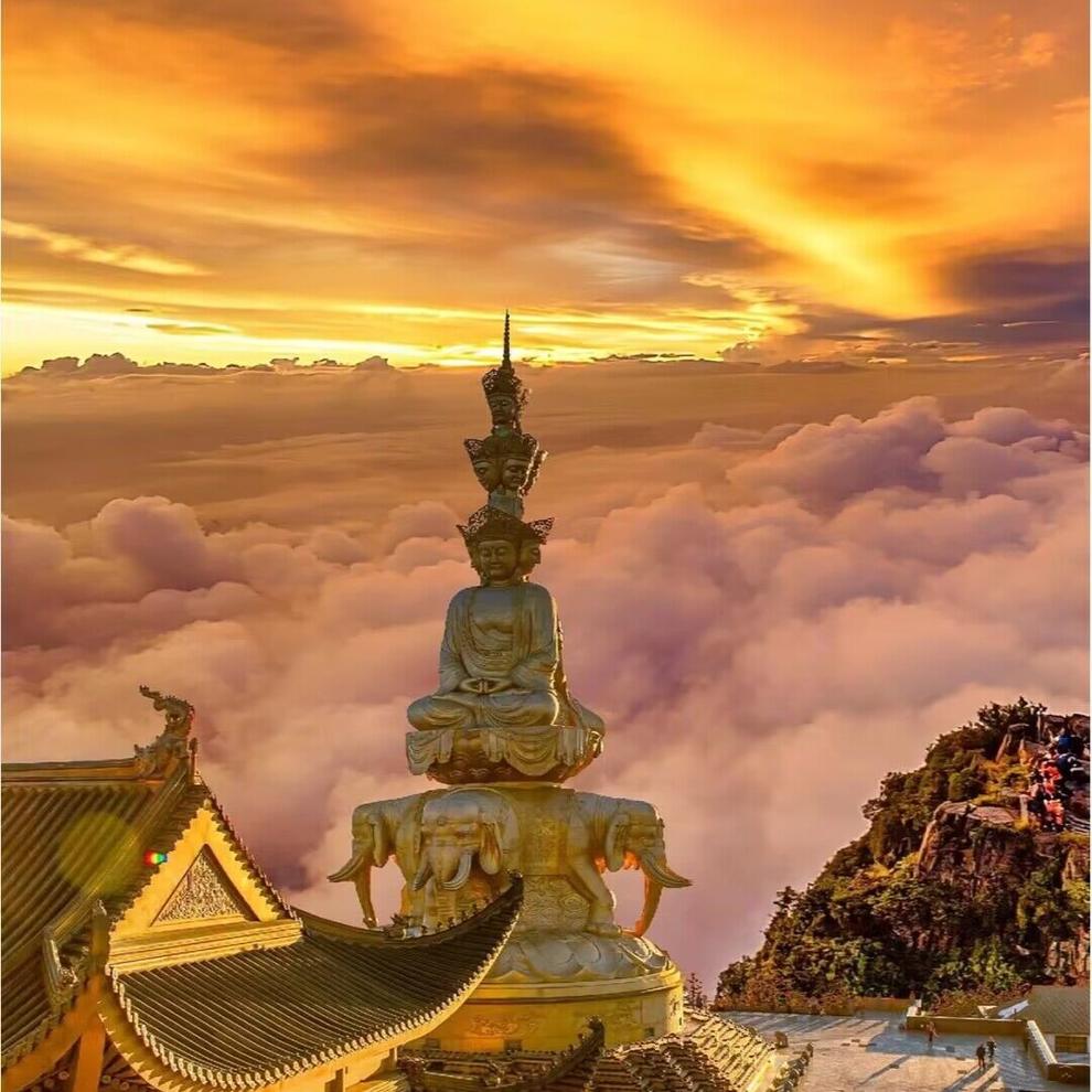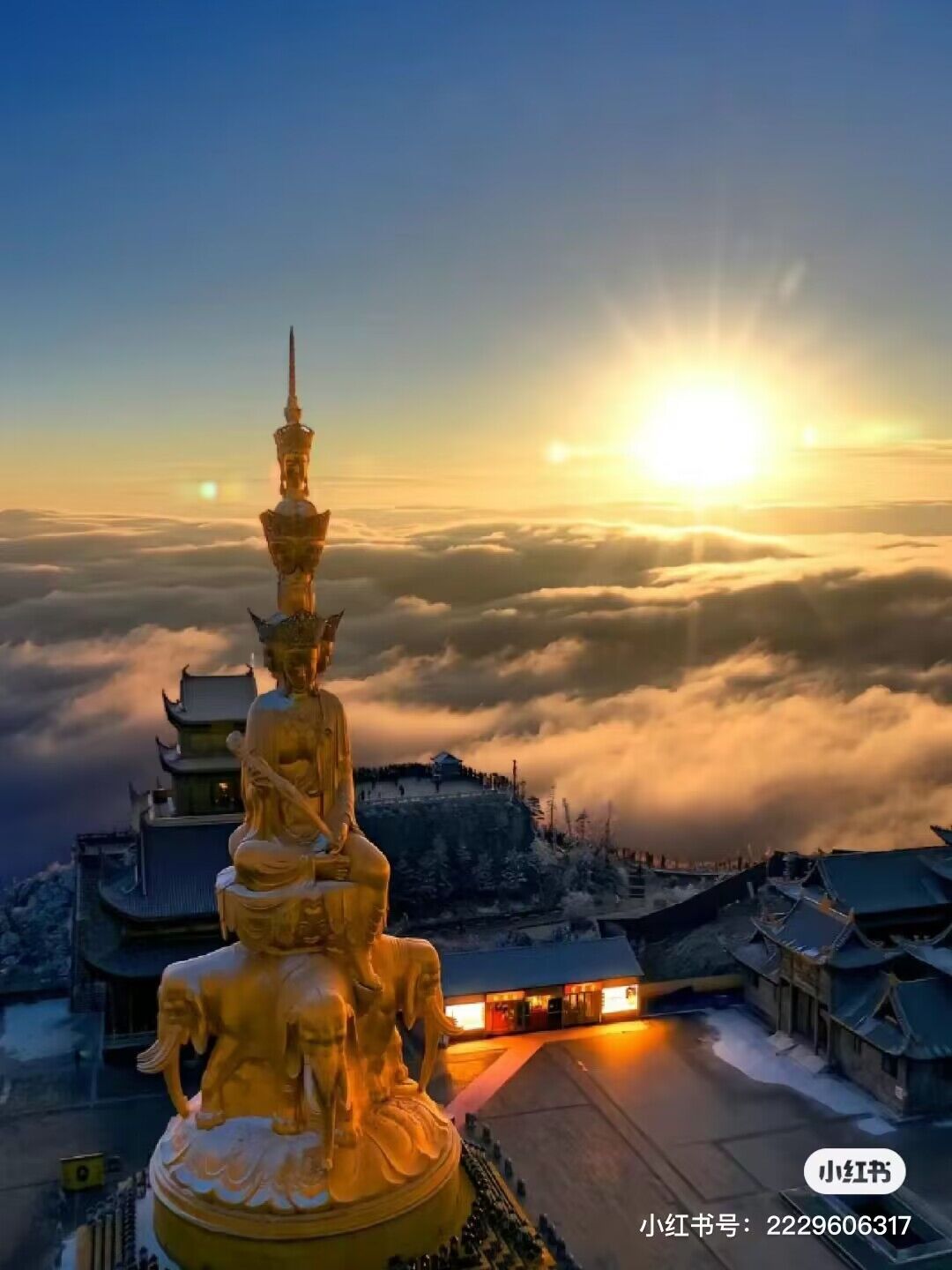 早餐后,前往峨眉山。【峨眉山-金顶】乘坐观光车(费用90元自理,上行索道80/下行索道40需自理)至雷洞坪,徒步至接引殿。峨眉金顶是以一尊48米高的十方普贤铜像为中心,由耀日的金殿、雄浑的铜殿、灼灼的银殿和洁白的朝圣大道组成的新金顶。金顶为峨眉山游程的最高峰,其海拔为3077米。顶上是个小平原,原有铜殿一座,在太阳的照射下,光彩夺目,故而得名金顶。登上金顶,人们顿觉万象排空,气势磅礴,惊叹天地之奇妙。在峨眉山金顶,还可能欣赏峨眉的四大奇景:日出、云海、佛光、圣灯。