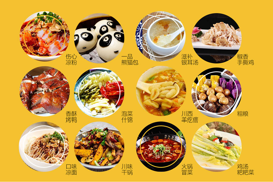 晚餐享用【熊猫主题小吃宴】:专属定制,精挑细选每一道本土小吃,吃的就是经典!凉菜:伤心凉粉、口味凉面,泡菜什锦;热菜:火锅冒菜,鸡汤耙耙菜,滋补银耳汤