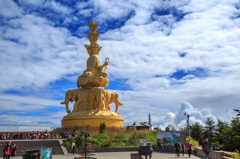 早餐后,前往峨眉山。【峨眉山-金顶】乘坐观光车(费用90元自理,上行索道80/下行索道40需自理)至雷洞坪,徒步至接引殿。峨眉金顶是以一尊48米高的十方普贤铜像为中心,由耀日的金殿、雄浑的铜殿、灼灼的银殿和洁白的朝圣大道组成的新金顶。金顶为峨眉山游程的最高峰,其海拔为3077米。顶上是个小平原,原有铜殿一座,在太阳的照射下,光彩夺目,故而得名金顶。登上金顶,人们顿觉万象排空,气势磅礴,惊叹天地之奇妙。在峨眉山金顶,还可能欣赏峨眉的四大奇景:日出、云海、佛光、圣灯。