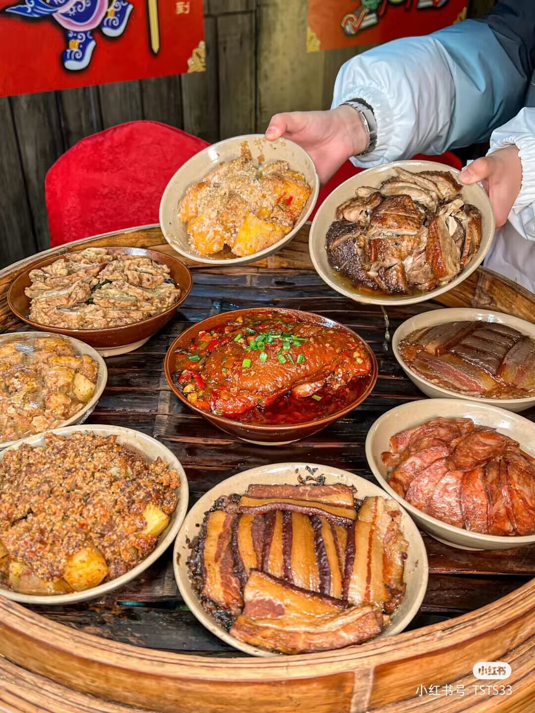太安豆瓣鱼,东坡肘子,野生菌烧肉,峨眉老腊肉,香切白斩鸡,农家香碗,野菜煎蛋饼,冰汁南瓜,炒野菜,时令蔬菜,天麻雪花笋炖鸡汤。
