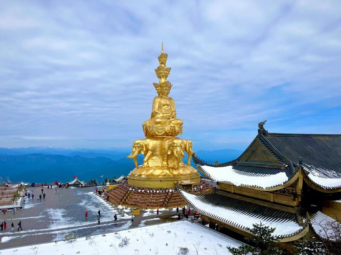 午餐后乘坐金顶往返索道(费用自理,往返120元/人)上金顶。峨眉金顶是以一尊48米高的十方普贤铜像为中心,由耀日的金殿、雄浑的铜殿、灼灼的银殿和洁白的朝圣大道组成的新金顶。金顶为峨眉山游程的最高峰,其海拔为3077米。在峨眉山金顶,还可能欣赏峨眉的四大奇景:日出、云海、佛光、圣灯。