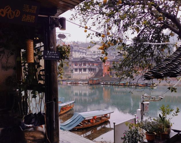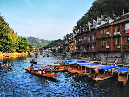 坐上农家小船欣赏凤凰古城沱江下游的风光。凤凰古城农家船景区可用“一江、两岸、三品、四桥”来表述。