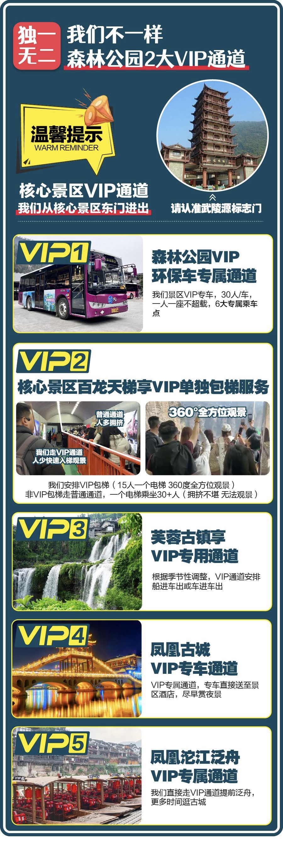 景区VIP专属通道:【独有】①张家界国家森林公园环保车VIP专属通道②百龙电梯VIP专属通道③芙蓉镇景区 VIP专属通道④凤凰古城进城免换乘VIP通道⑤沱江泛舟VIP专属通道