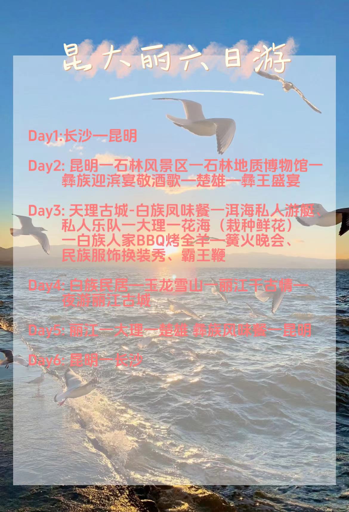 1、交通:长沙—昆明往返经济舱,含机场建设及燃油费;当地空调旅游大巴