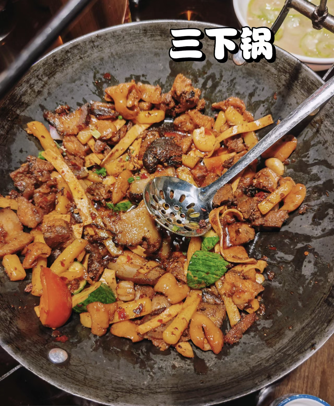 中餐升级为特色风味餐“三下锅”,张家界头牌菜,2009年荣登湖南14市州故乡菜之首。传明代嘉靖年间,朝廷征调湘鄂西土司兵上前线抗倭,恰好赶上年关,为不误军机,土司王下令提前—天过年,于是腊肉、豆腐、萝卜一锅煮,叫吃“合菜”,逐演变成“三下锅”。