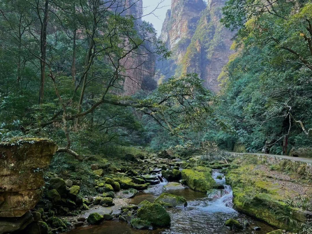 游览【张家界国家森林公园】-因溪水流经金鞭岩而得名的【金鞭溪】:张家界的黄金旅游区,水绕四门,蜿转曲折,幽静异常,随山而移,穿行在峰峦幽谷云间,迤逦延伸于鸟语花香之中(游览时间不少于2小时),车返市区,下午乘车返回张家界市区后自由活动(正常行车时间1小时,全程县道)。