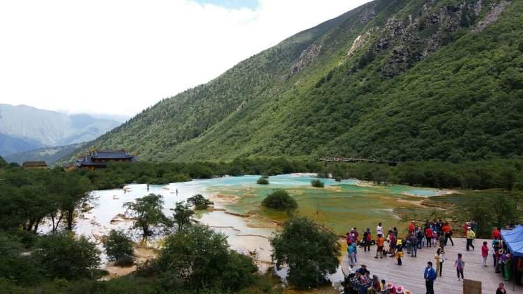 黄龙景区:黄龙因五彩池而闻名,大大小小的钙化池,奔流而下,五彩缤纷。