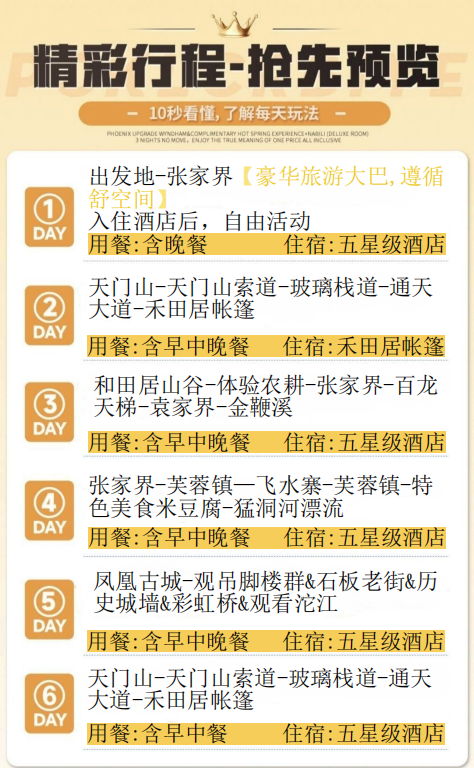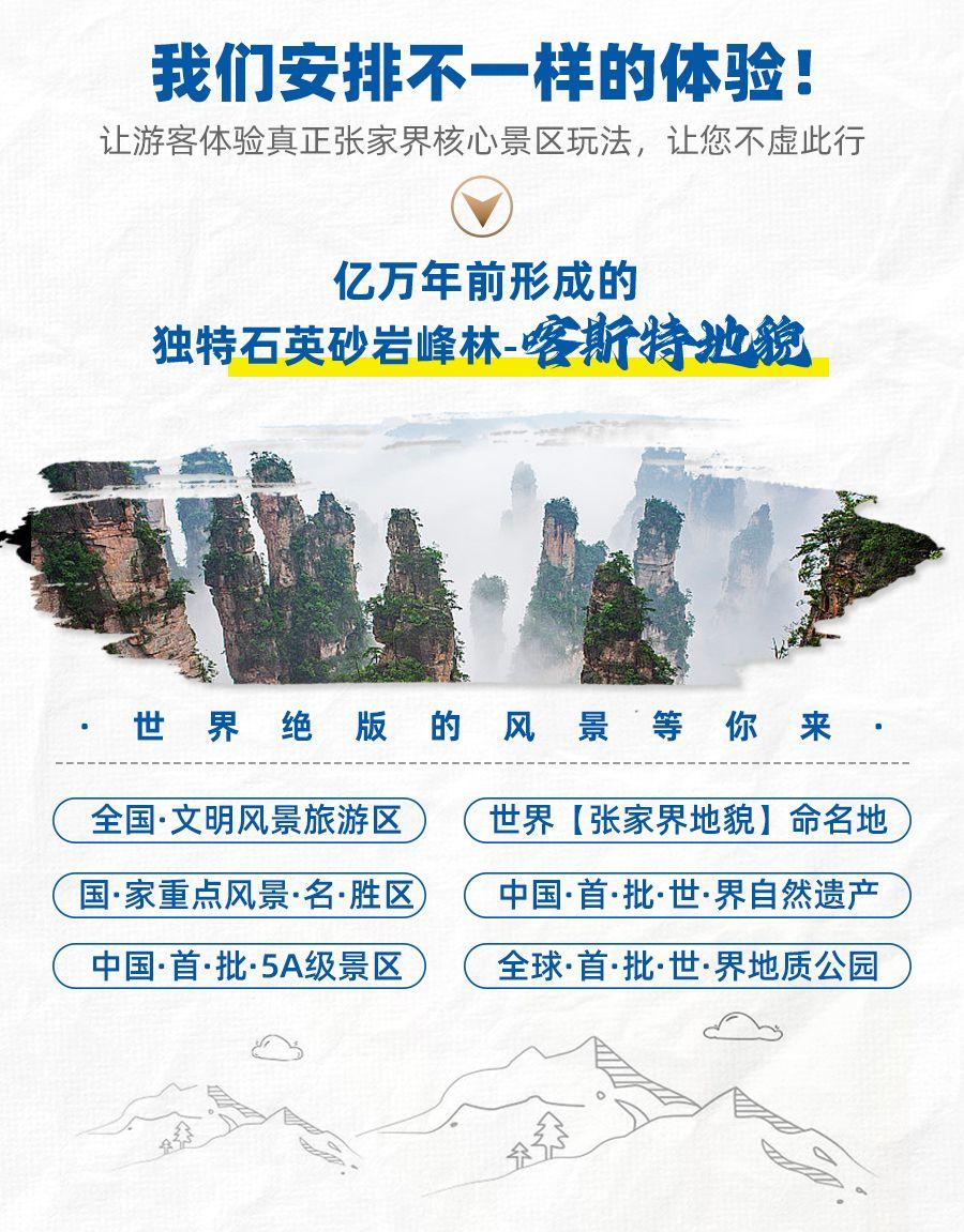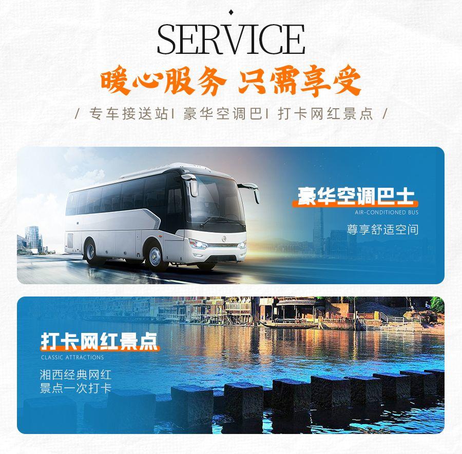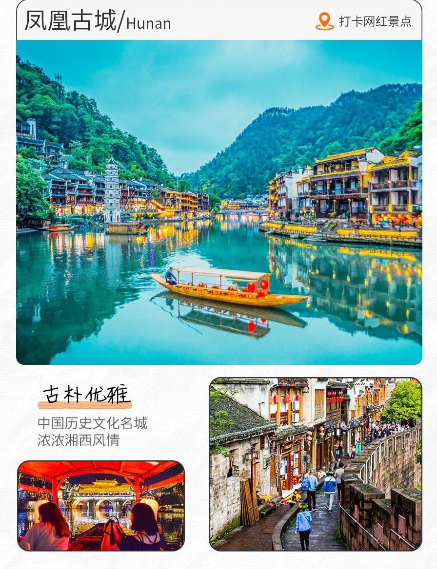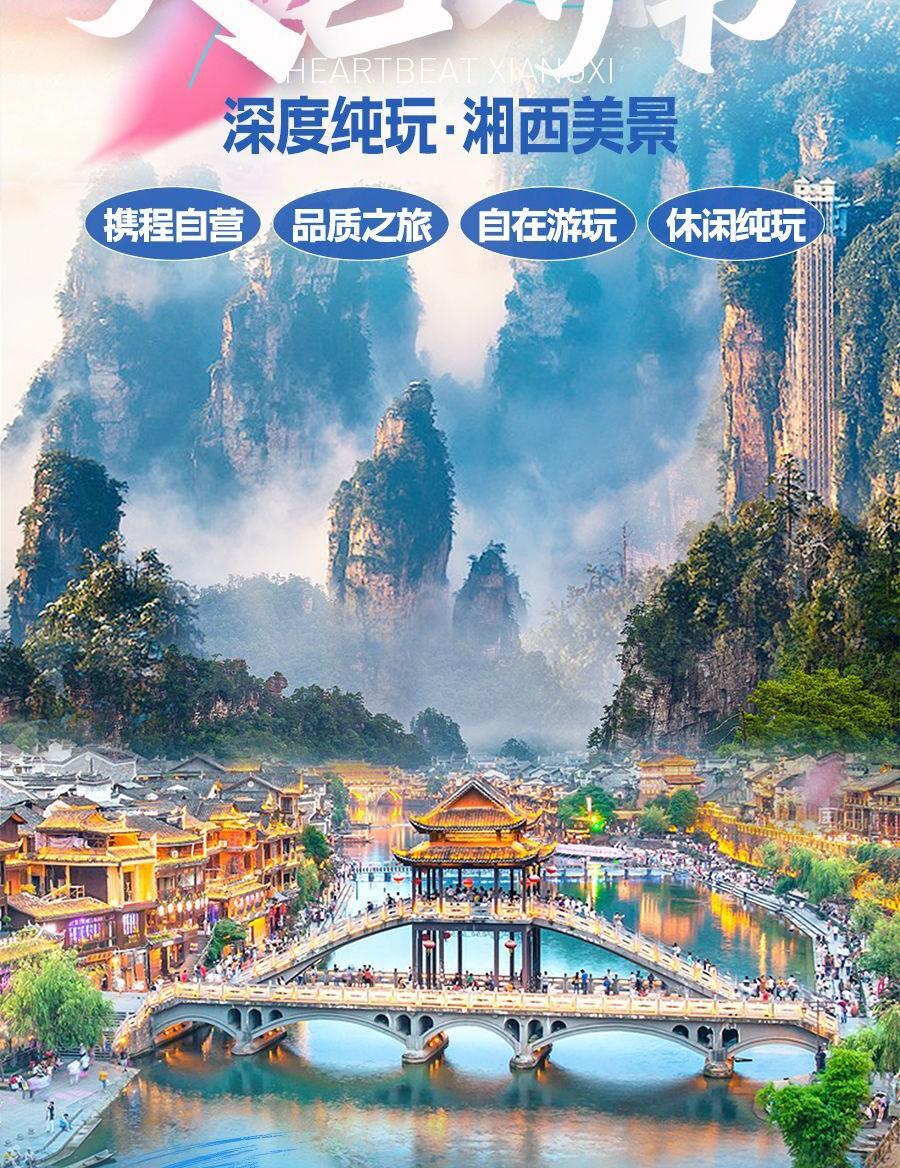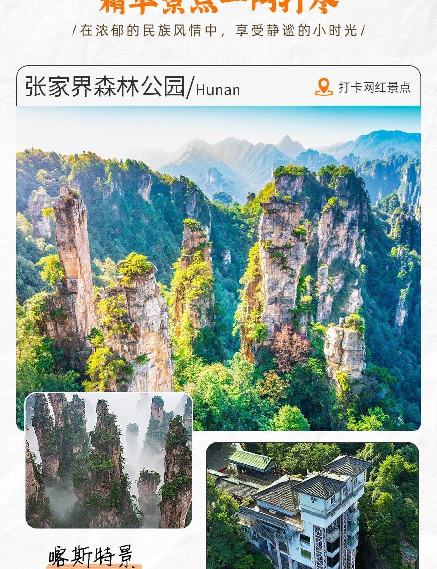 缤纷景点:【精华景点都囊括】张家界国家森林公园(赠百龙天梯双程),天门山国家森林公园(7455米高空索道/玻璃栈道),芙蓉镇(瀑布上的千年古镇),凤凰古城(中国历史文化名城),韶山(瞻仰伟人故里)