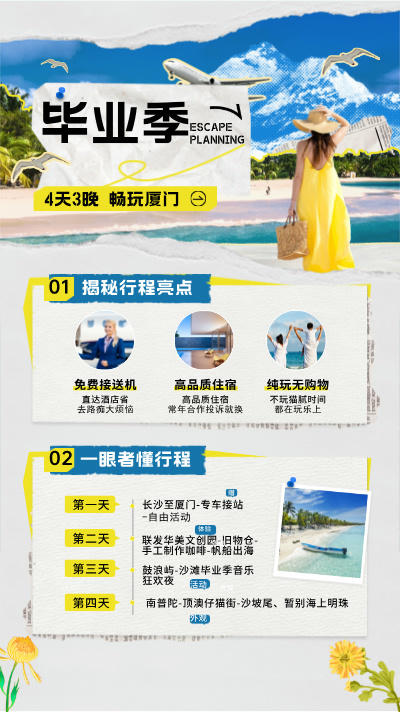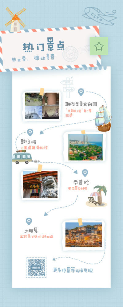 | 行程中所列景点和活动: 联发华美文创,旧物仓,帆船出海,鼓浪屿,沙滩毕业季音乐狂欢夜,南普陀,顶澳仔猫街,沙坡尾,暂别海上明珠 |