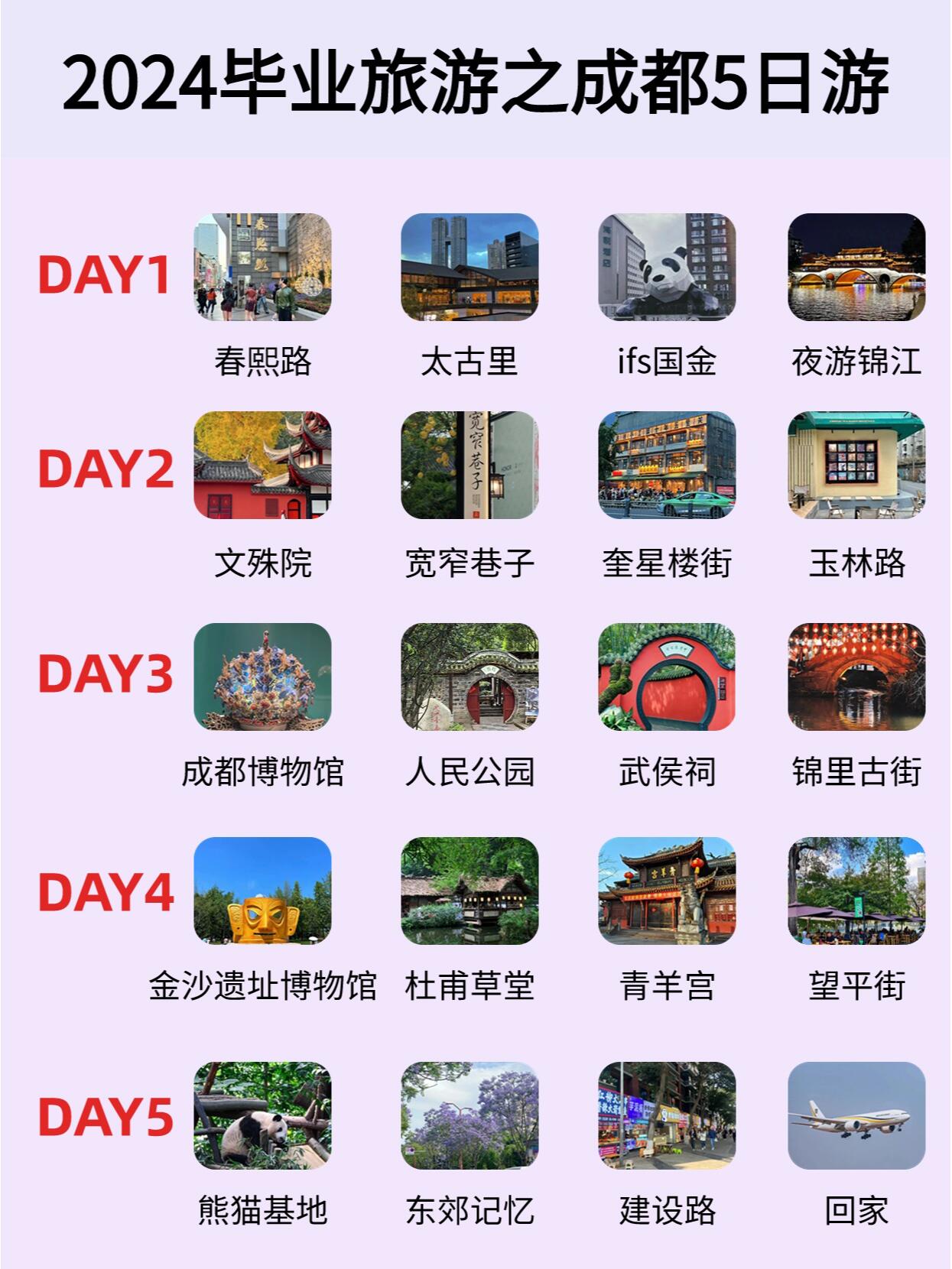 下午:收拾行李,办理退房手续,乘坐送机/送站服务,结束愉快的成都之旅。