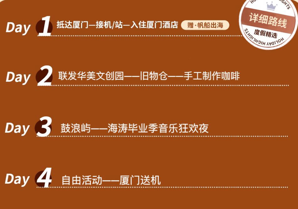 早餐后,前往游览昔日的“华美制烟”老厂房改造的【联发华美文创园】时尚艺术的影子,再到厦门老物件的聚集地【旧物仓】搜罗古董玩意。安排一次独特的【手工咖啡制作体验】。午餐后以CityWalk的方式带大家重新认识厦门,一起到土生土长的老城区看看,走过市井的【百家村】,途径诗意【华新路】还可步行至【演武大桥观景台】;后于【环岛路帆船中心】乘帆船出海体验:美丽迷人的五缘湾景,海天一色的蓝色天堂,升帆、拉帆亲身体验水上运动的激情与魅力!将烦恼、疲倦和困惑统统抖落在容纳百川的大海里。然后车送酒店休息。