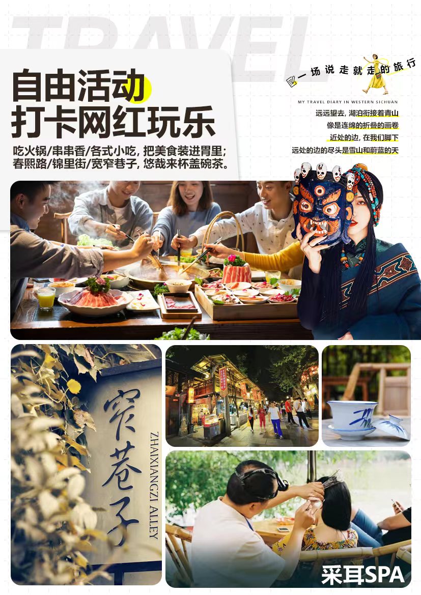 早餐后漫步成都人民公园享誉盛名的老茶馆一【鹤鸣茶社】 鹤鸣茶社是成都最老的传统茶馆之一,迄今已近百岁,作为2012 年成都首批历史建筑挂牌保护对象之一,鹤吗茶社的川西风格建筑每一处都让人感受着传统老成都的味道。人民公园对面的【熊猫邮局】并非单纯嵌入“熊猫”元素的普通邮局,他是唯一的、本土的、成都的。“熊猫邮局”拥有全球唯一专属自己的印记一专用日戳和指定邮政编码 610088。编码数字除便于记忆外,“88”两个数字加入设计元素,生动地展现了熊猫憨态可掬的形象。随后前往对面【宽窄巷子】游览,宽巷子不宽,窄巷子不窄,这里是成都的名片,是“最成都”的生活态,这里承载着老成都美好记忆,包容、从容、闲适、自在,更向世人讲述着老成都的世事沧桑,也应了这句话一—成都,一个来了就不想离开的地方。