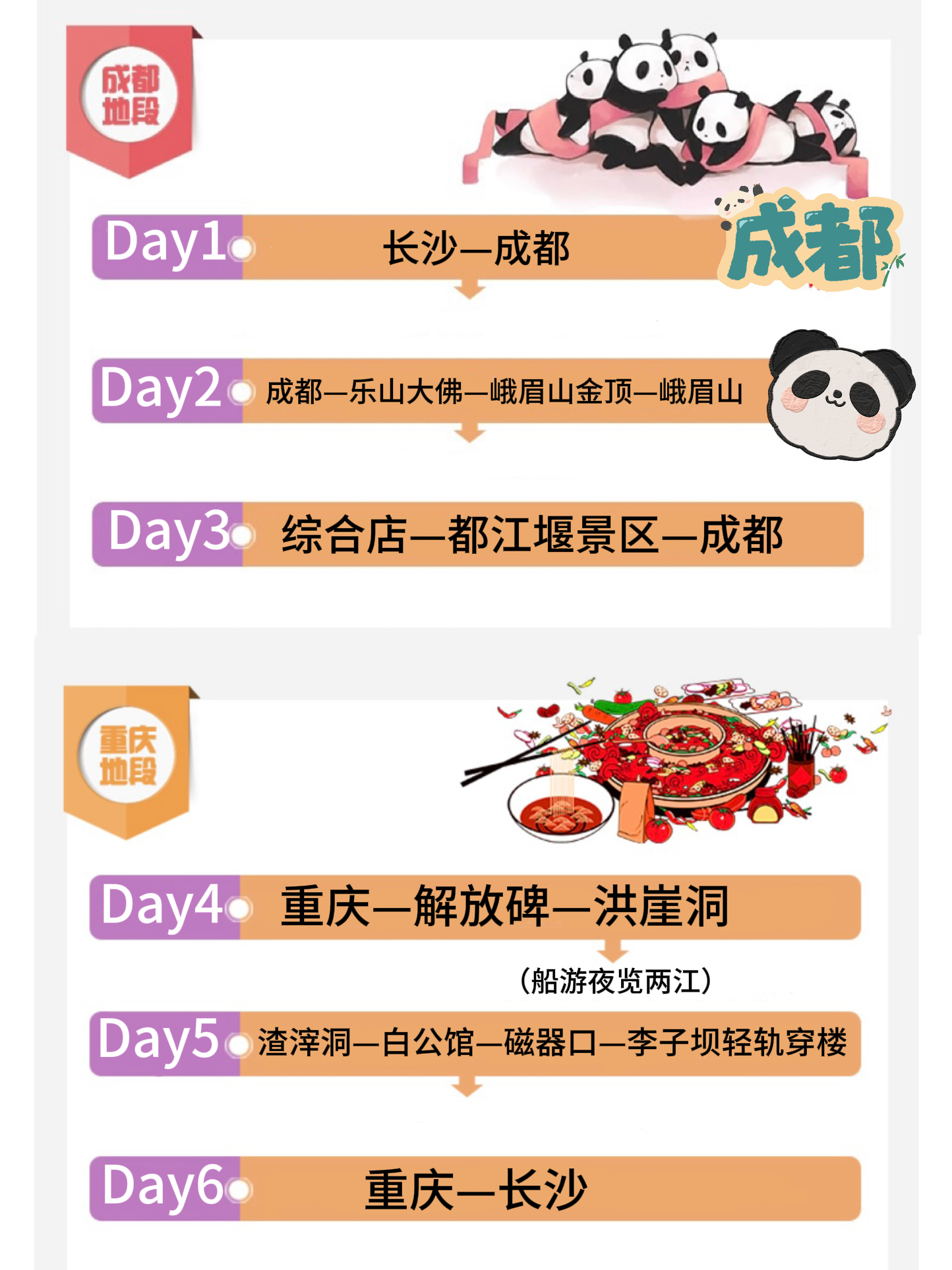 1、交通:长沙-成都,重庆-长沙往返高铁二等座;当地空调旅游大巴