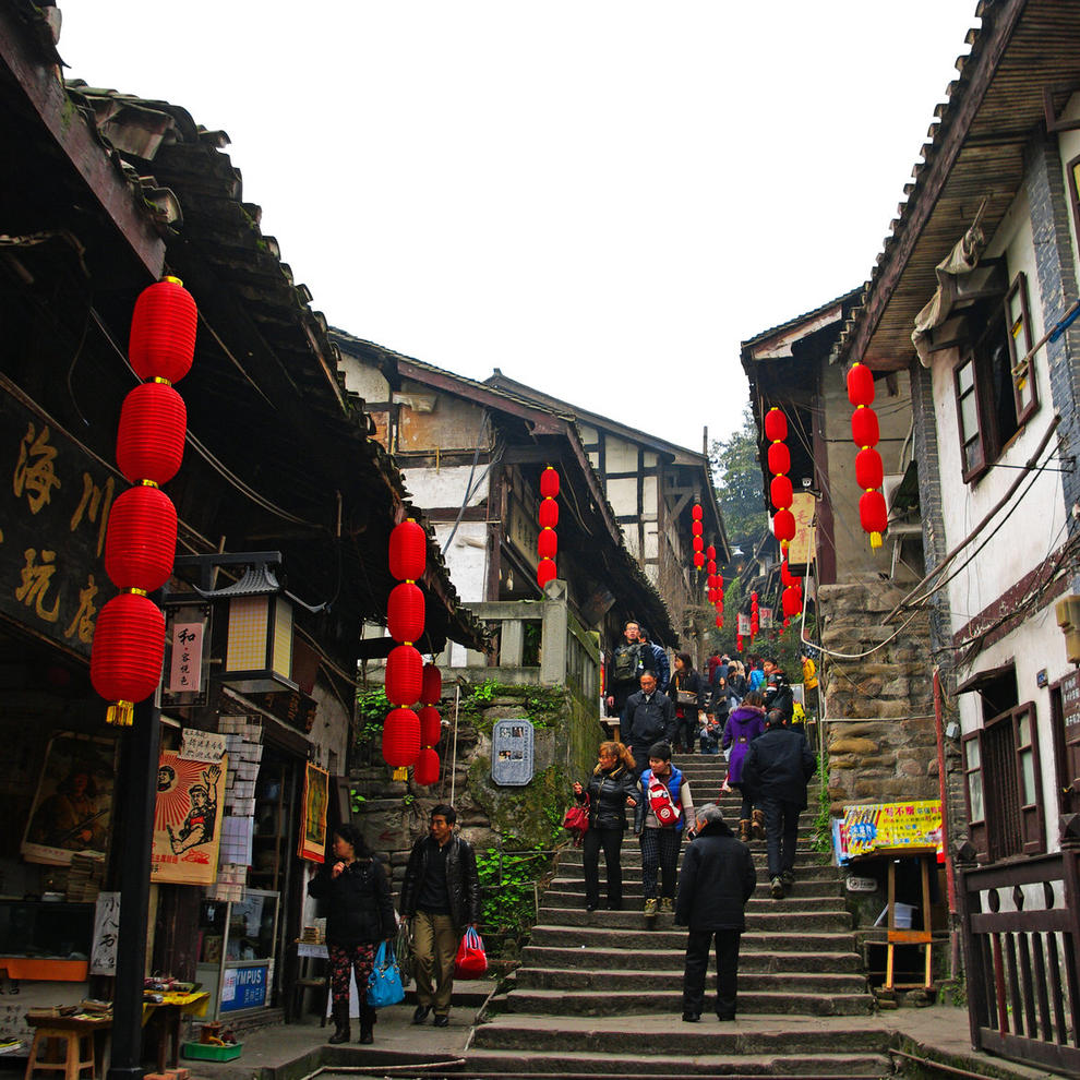 千年古镇磁器口位于重庆市沙坪坝区嘉陵江畔,始建于宋代,拥有"一江两溪三山四街"的独特地貌,形成天然良港,是嘉陵江边重要的水陆码头。曾经"白日里千人拱手,入夜后万盏明灯"繁盛一时。磁器口古镇蕴含丰富的巴渝文化、宗教文化、沙磁文化、红岩文化和民间文化,各具特色。一条石板路千年磁器口,是重庆古城的缩影和象征。被赞誉为"小重庆"。磁器口古镇开发有榨油、抽丝、制糖捏面人、川戏等传统表演项目和各种传统小吃一条石板路千年磁器口,是重庆古城的缩影和象征。被赞誉为"小重庆"。