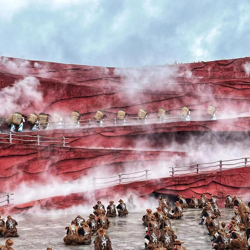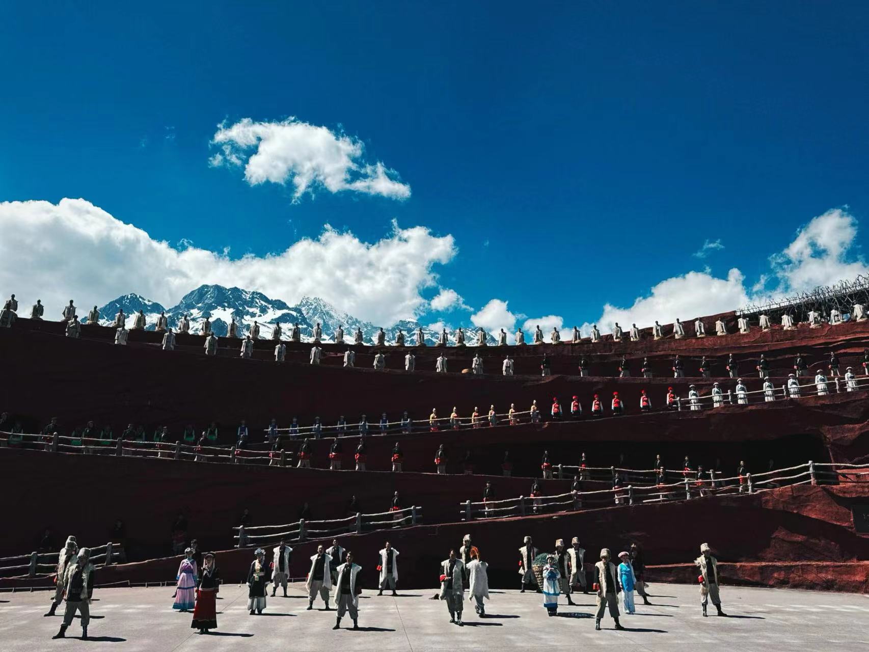 【印象丽江】印象丽江剧场位于海拔3100米的玉龙雪山甘海子,以玉龙雪山的雄峰为天然背景,演员由来自10个少数民族的500个农民组成。