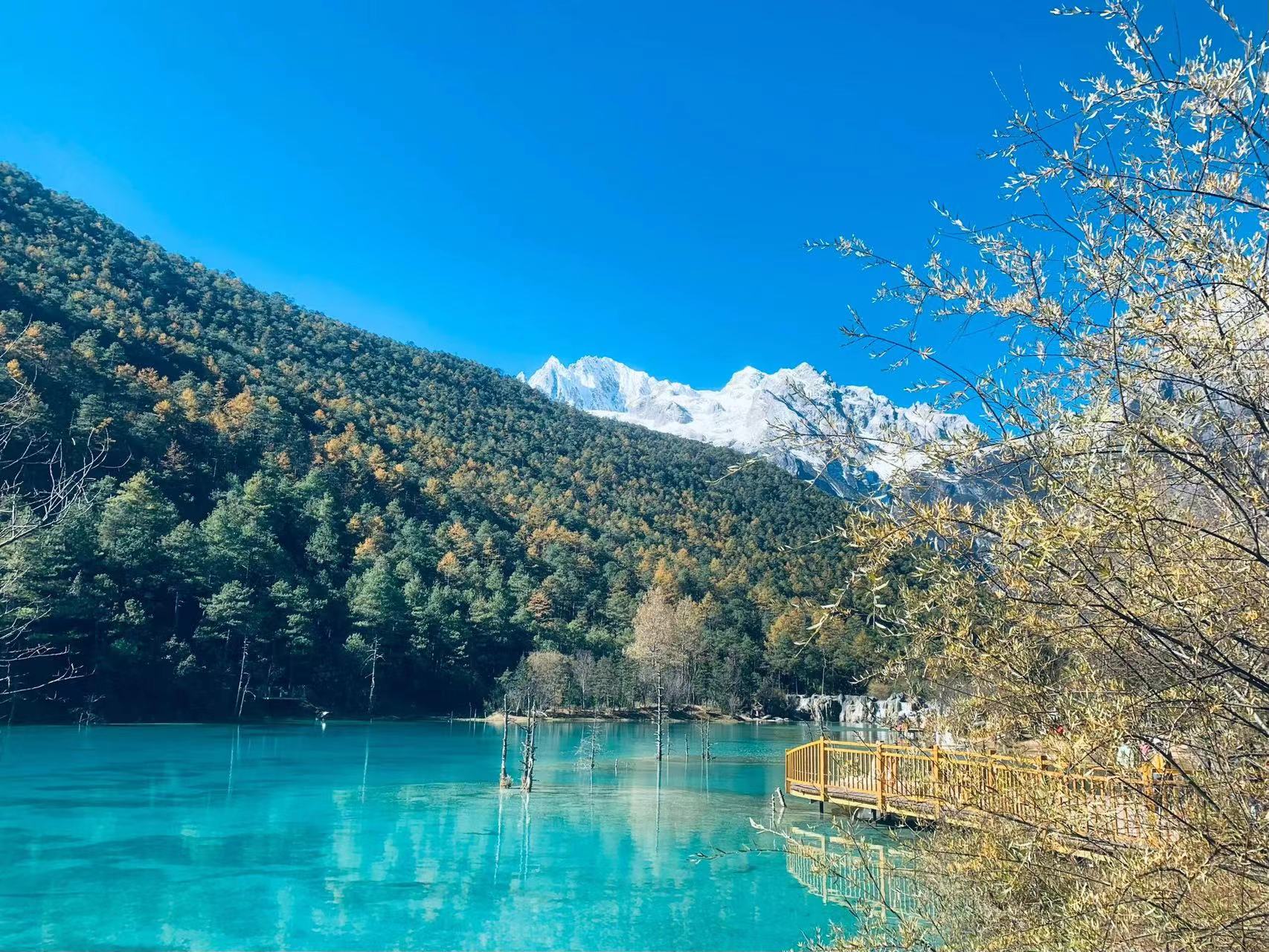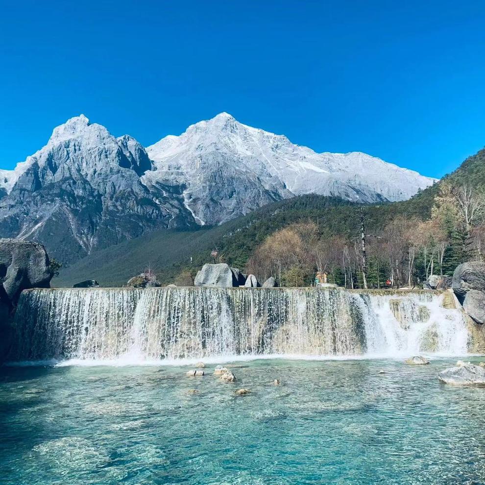 【蓝月谷】摄影爱好者的摄影圣地,其前身为早前人们所熟知的"白水河"。在晴天时,水的颜色是蓝色的,而且山谷呈月牙形,远看就像一轮蓝色的月亮镶嵌在玉龙雪山脚下,所以名叫蓝月谷。而白水河这个名字是因为湖底的泥巴是白色的,下雨时水会变成白色,所以又叫白水河。