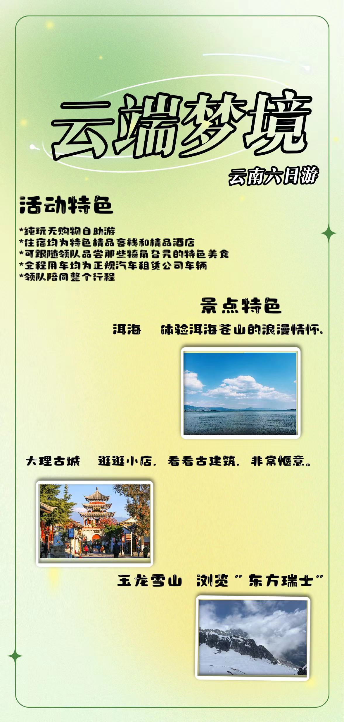 全天 乘飞机抵达昆明长水国际机场,请你携带好行李后从国内到达A出口至4号大厅右手边的麦当劳打接机电话13518753089,工作人员会来接您;下飞机后电话请保持畅通,以便我们及时联系。抵达夏无酷暑、冬无严寒、气候宜人素有“春城”美誉的国家级历史文化名城昆明,接机组安排办理入住酒店手续。稍作休整之后,可以自行品尝昆明小吃。