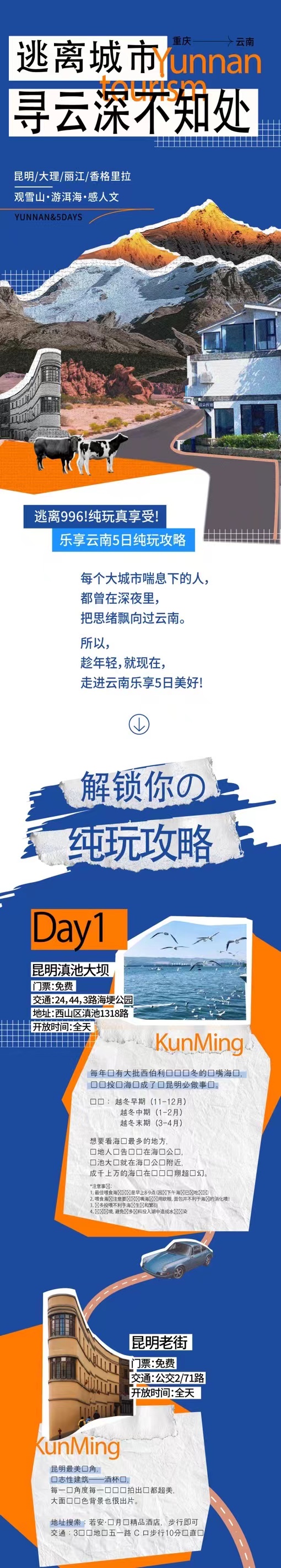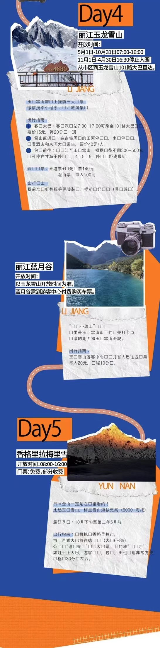 午餐后【玉龙雪山】游览具有“东方瑞士”之称的玉龙雪山景区(游览甘海子,白水河,乘冰川大索道到其主峰扇子峰,是纳西族及丽江各民族心目中的神山),那里海拨4506米,索道全长2914米,垂直高差1150米,是我国海拨最高的旅游客运索道之一。玉龙雪山是离赤道最近的雪山群,是三朵神的化身。【冰川大索道】(赠送玉龙雪山防寒服和氧气瓶)。游玉龙雪山从海拔3000米的草甸出发,穿越高大的松杉树林,远眺纳西圣山,欣赏雄奇壮丽的玉龙雪山。【印象丽江】赠送价值280元的大型歌舞表演印象丽江剧场位于海拔3100米的玉龙雪山甘海子,以玉龙雪山的雄峰为天然背景,演员由来自10个少数民族的500个农民组成。【蓝月谷】摄影爱好者的摄影圣地,其前身为早前人们所熟知的"白水河"。在晴天时,水的颜色是蓝色的,而且山谷呈月牙形,远看就像一轮蓝色的月亮镶嵌在玉龙雪山脚下,所以名叫蓝月谷。而白水河这个名字是因为湖底的泥巴是白色的,下雨时水会变成白色,所以又叫白水河(电瓶车60元/人自理)。随后乘大理或丽江动车返回昆明,欣赏沿途的高原风光。