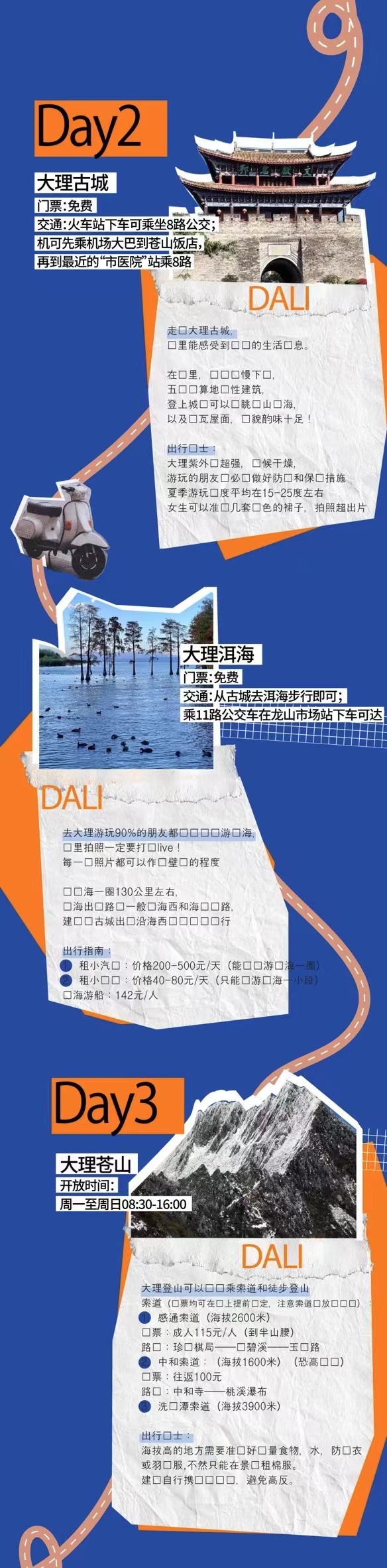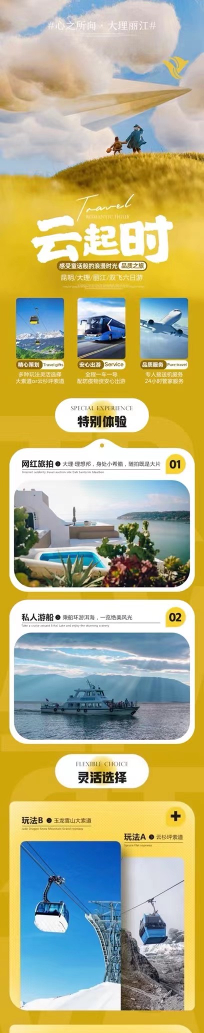 家人、朋友,坐着吉普车,环游洱海,吹吹海风,在蓝天白云间放肆奔驰。(一车四人,配备驾驶员,若因天气因素影响,取消活动,旅客需知!!)【天空之境】网红打卡地,大理的天空蓝得清澈又明丽,朵朵漂移的白云就像一团团棉花糖,在晴朗的天空下,把蓝天和白云揽入怀里,美不胜收。站在唯美的天空之境,给自己来一张艺术照,何须滤镜,单反,手机也能拍出惊艳的你,刷爆你的朋友圈!后游览【大理古城】大理古城位于风光秀丽的苍山脚下,是古代南诏国和大理国的都城。这里是个适合生活的地方,当地的生活节奏很慢,阳光明媚,温度也十分适宜,在古城里逛逛小店,看看古建筑,非常地惬意。外国友人向往的地方和他们旅居大理的温馨家园,大理古城内东西走向的护国路西段是外国游客在大理的集散地。这里各色咖啡店 众多,中西风味餐厅、珠宝店、古董店、扎染店、画廊等也随之兴起,铺面林立两侧,琳琅满目,目不暇接,成为中外有名的【洋人街】。