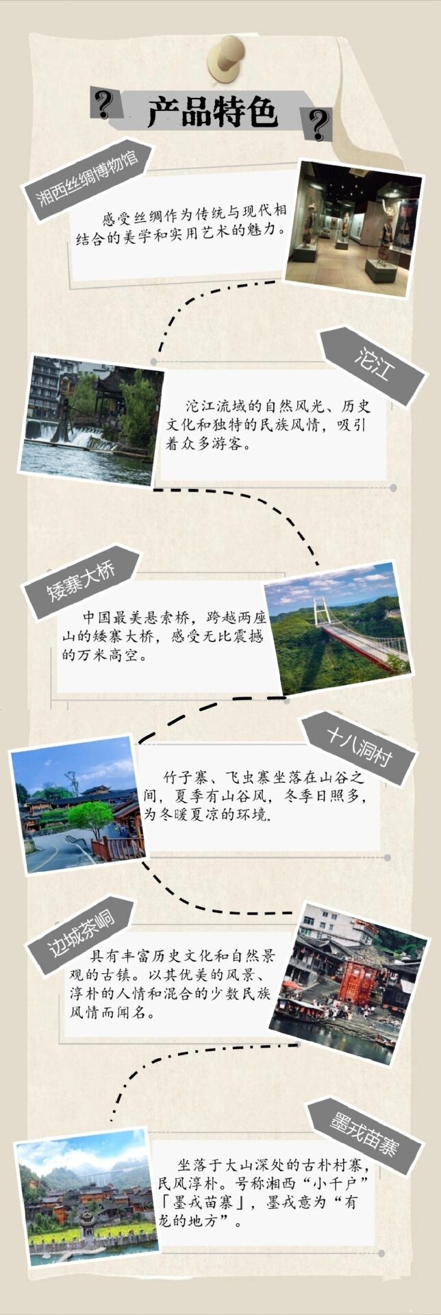 该村地处高寒山区,冬长夏短,属高山溶岩地区,平均海拨700米,生态环境优美,境内自然景观独特,被誉为“小张家界”。后乘车前往【边城茶峒】(门票已含),这里是湘黔渝三省市交界之地,是一脚踏三省的插花地,边城古建筑群立,其工艺、造型独特,土家苗寨风情别具一格。可参观百家书法园,名联坊,乘船上翠翠岛游览等。