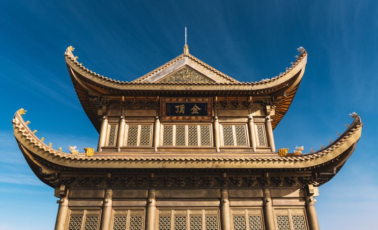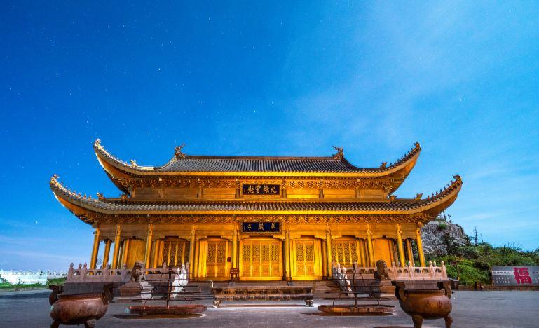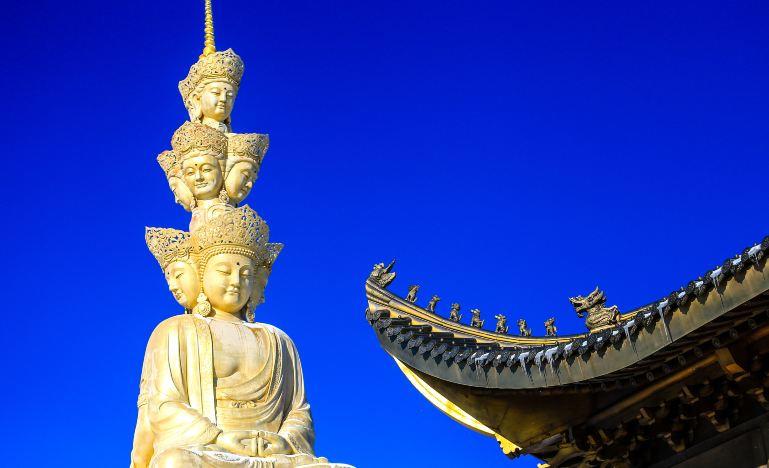 金顶是峨眉山的山顶,金顶上的四面十方普贤菩萨金像,是众多游客来峨眉山的必体验之地。这里海拔3079米,除了高达48米的铜制十方普贤像外,金顶还有一座华严寺,可供信众祈福礼佛。