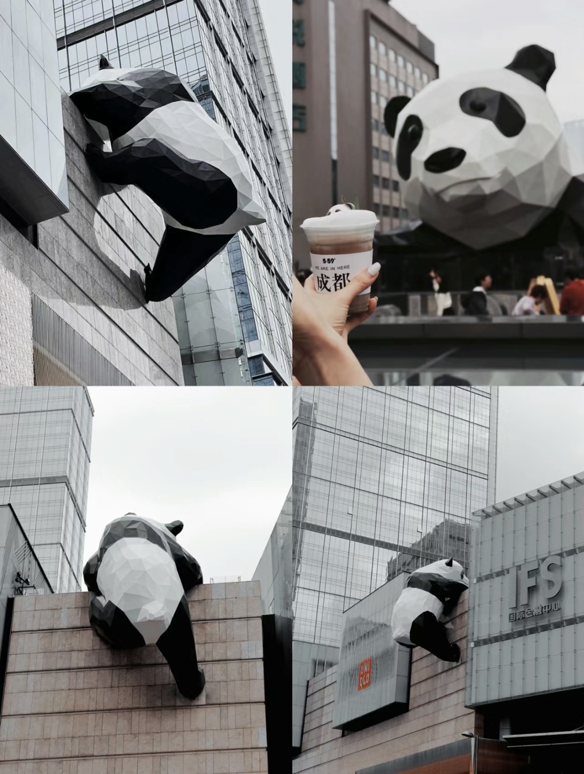 成都最火最网红的,莫过于【IFS“熊猫爬墙” 】了,独特的设计思路,让一个肥肥大大的大熊猫一半身体挂在商场的外边,一半身体爬上商场的花台,基本上你每天都能看到露天花台上排着队的人跟熊猫的大头拍照,然后商场旁边的步行街上一群人拿着相机对着熊猫的屁股拍照。 【成都远洋太古里】坐落成都中心地带,紧接春熙路地铁站,尽享优越交通和人流优势,比邻的千年古刹大慈寺更为其增添独特的历史和文化韵味。【方所】位于太古里地下一隅,与其说是一家书店,不如说它是一种装进文艺里的生活。