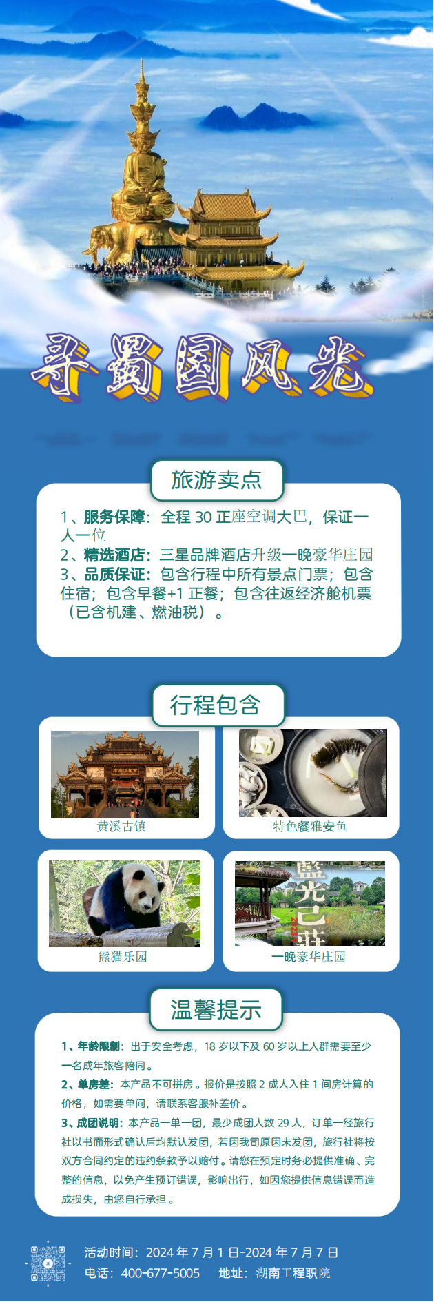 1、交通:往返长沙-绵阳经济舱,含机场建设及燃油费;当地空调旅游大巴